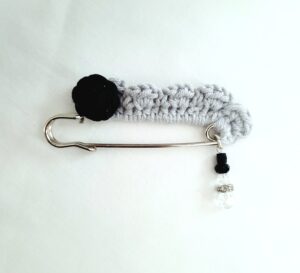 Crochet Brooch Pin – Light Grey with Snowman and Black Flower Charm