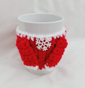 Coffee Cup Sleeve – Crochet Reusable Cup Cozy – Red/White with Snowflake Button