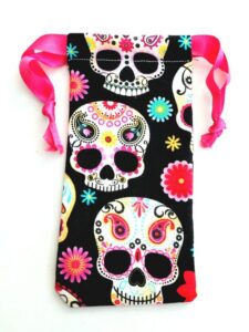 Drawstring Bag – Reusable Gift & Storage Pouch – Mini Sugar Skulls with Pink Ribbon