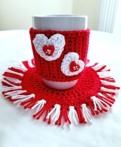 Coffee Cup Sleeve – Crochet Reusable Cup Cozy – Red and White Hearts with Mug Rug