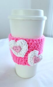 Coffee Cup Sleeve – Crochet Reusable Cup Cozy – Pink with White Hearts