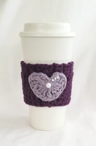 Coffee Cup Sleeve – Crochet Reusable Cup Cozy – Purple with Lavender Hearts