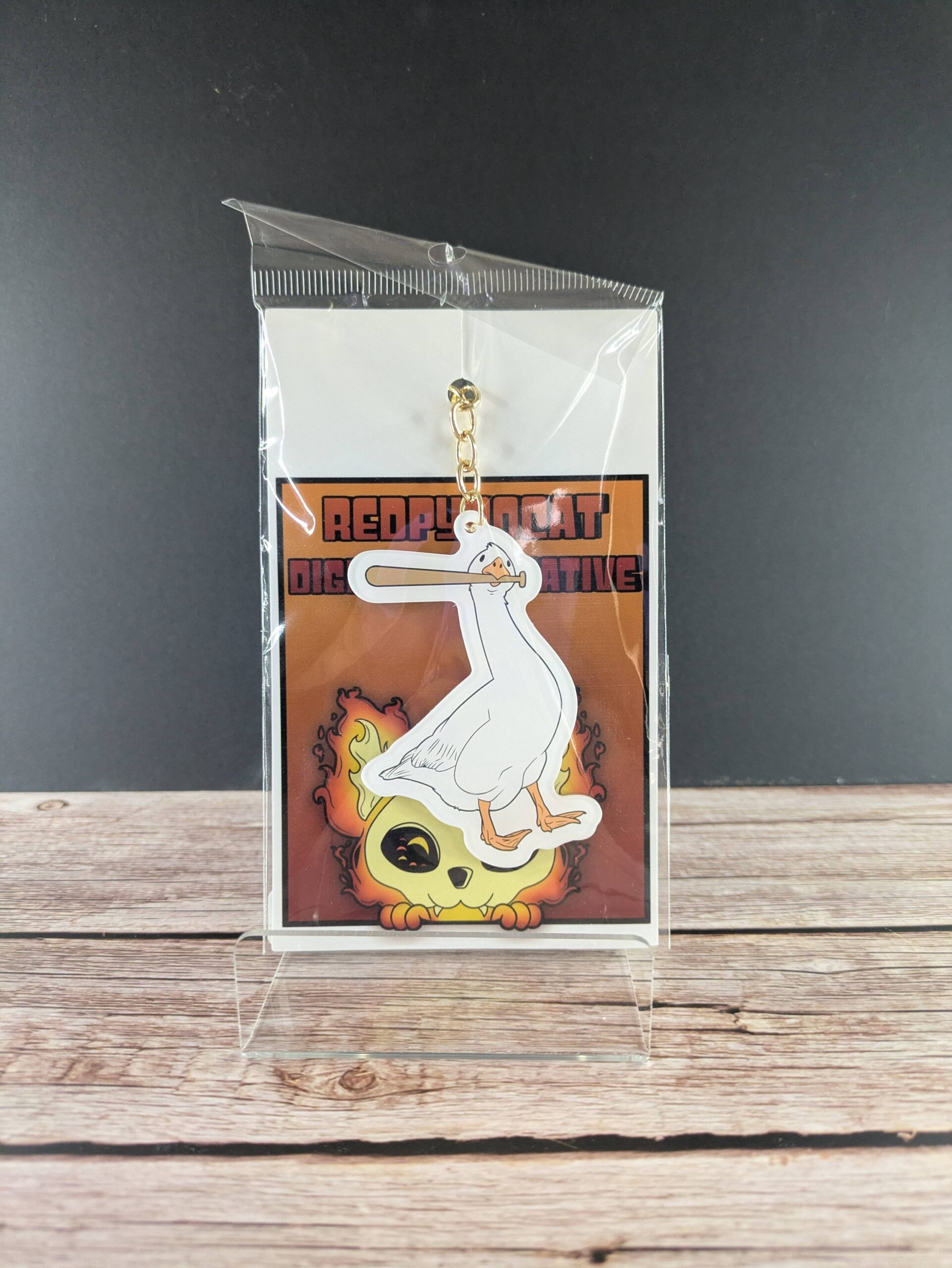 Carry a tiny dose of delightful menace with this super cute 3-inch keychain! It shows a goose looking ready for anything, firmly gripping a baseball bat in its beak. It’s quirky, funny, and uniquely awesome!