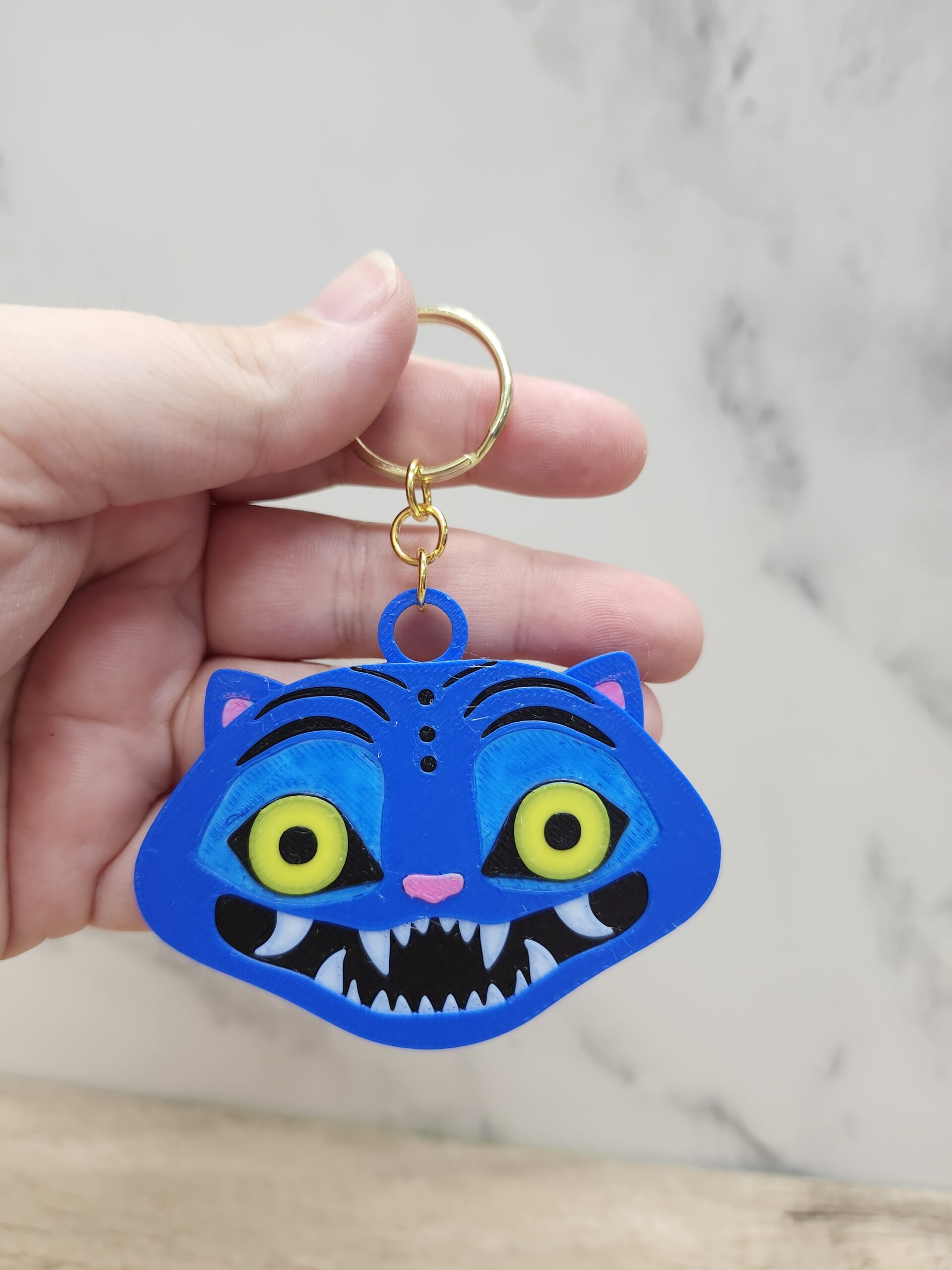Add this fun goofy demon tiger to your keychain collection. This pin is 3D printed with a gold keyring.
