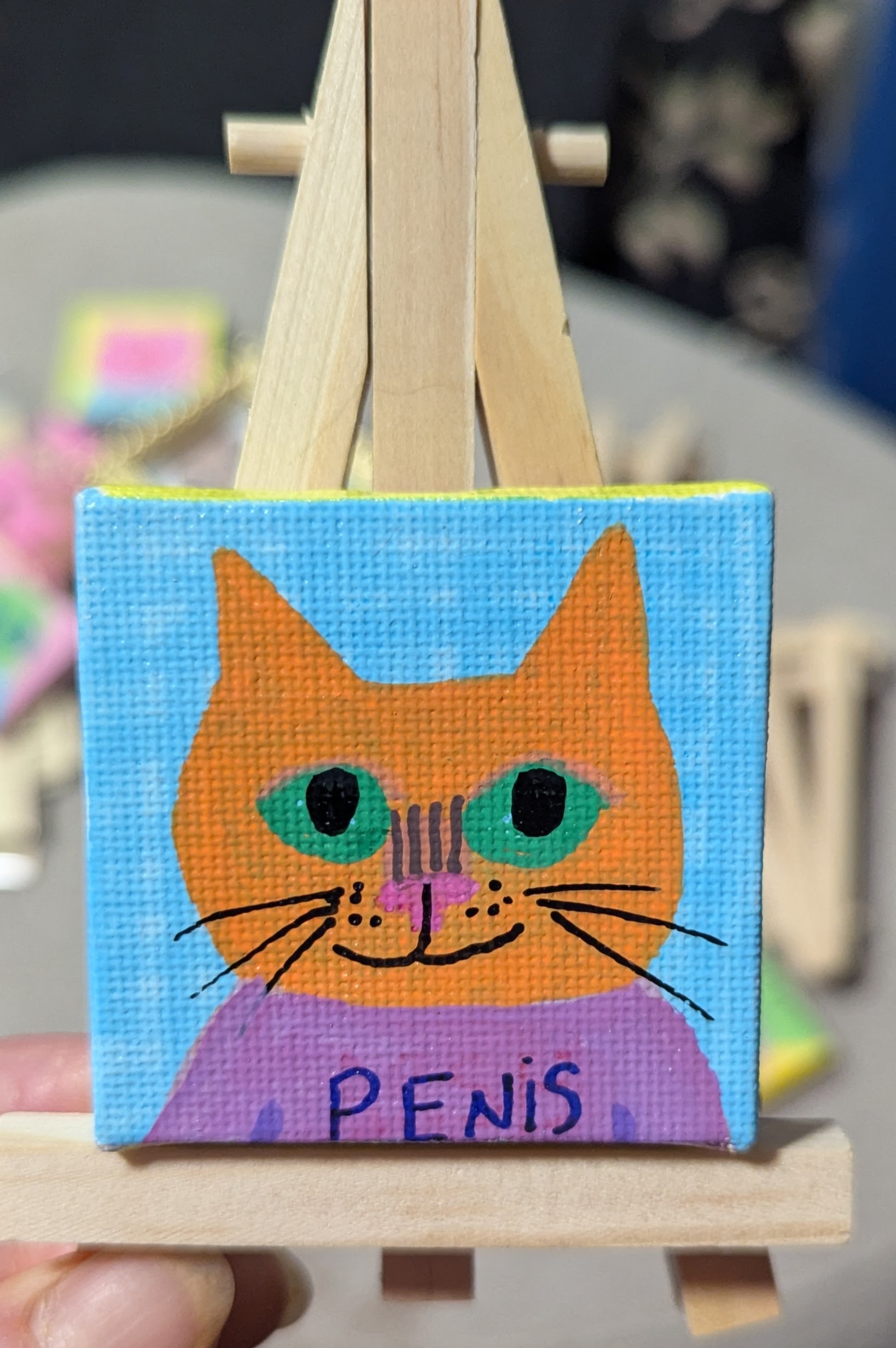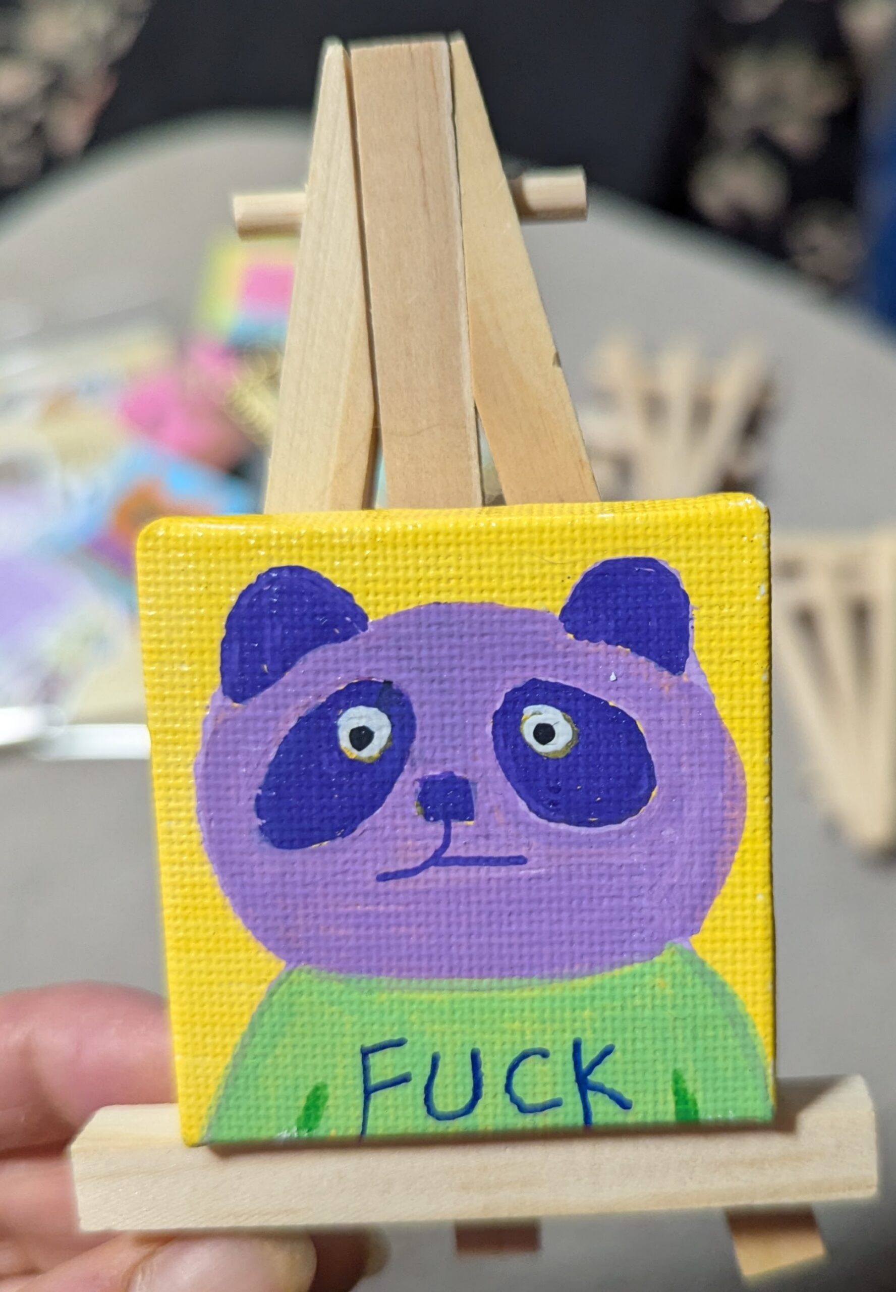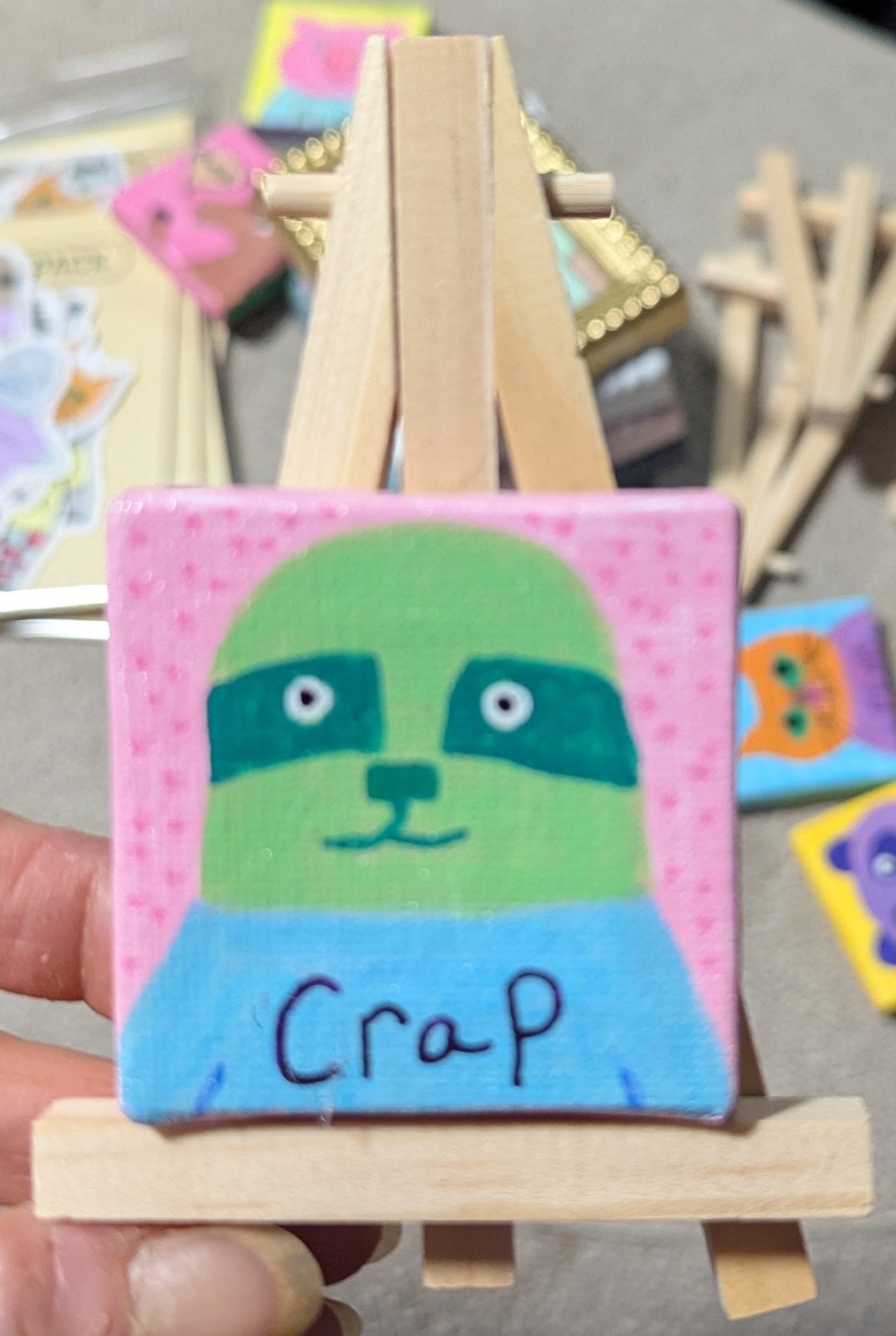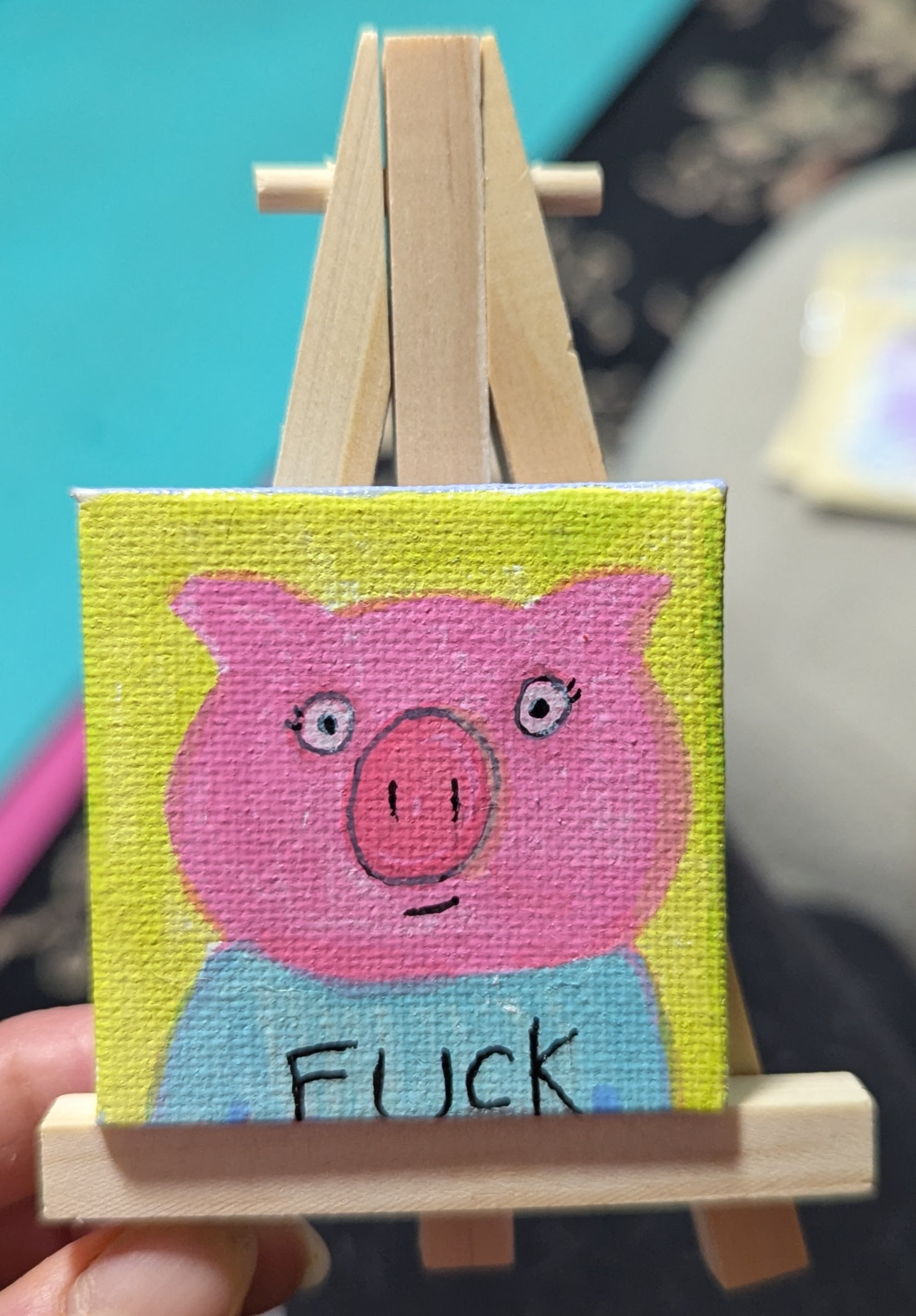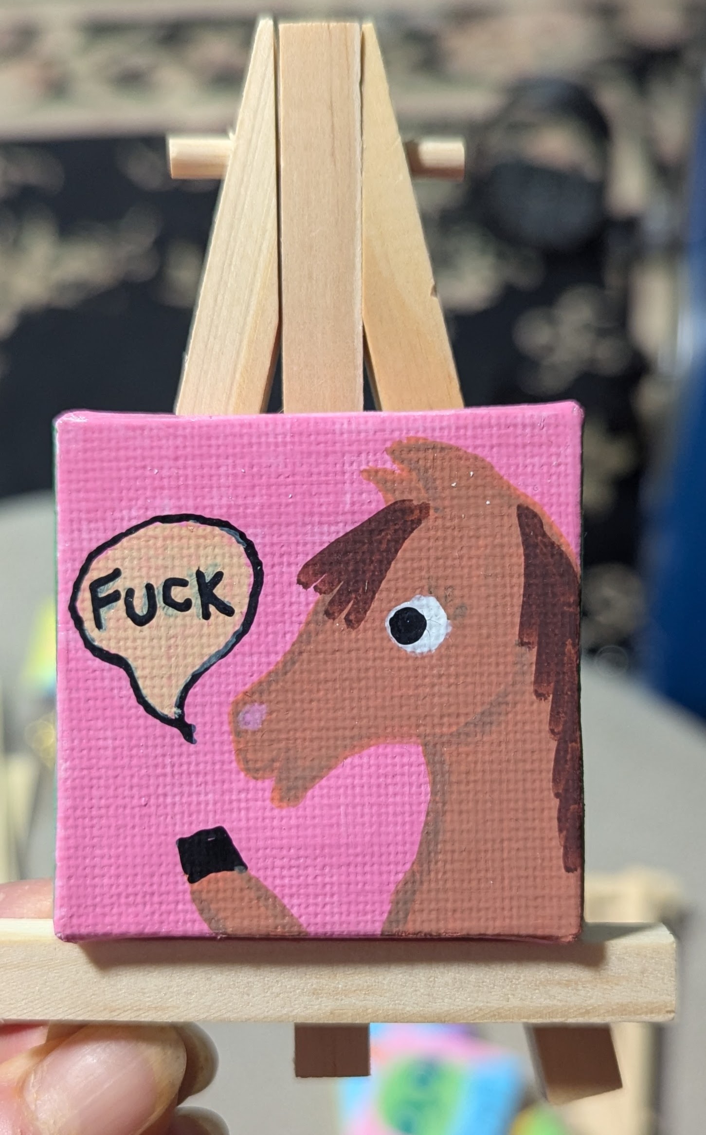 2″x2″ canvas with original drawing using acrylic markers. Suitable for hanging on the wall or anywhere else you like potty mouthed critters.