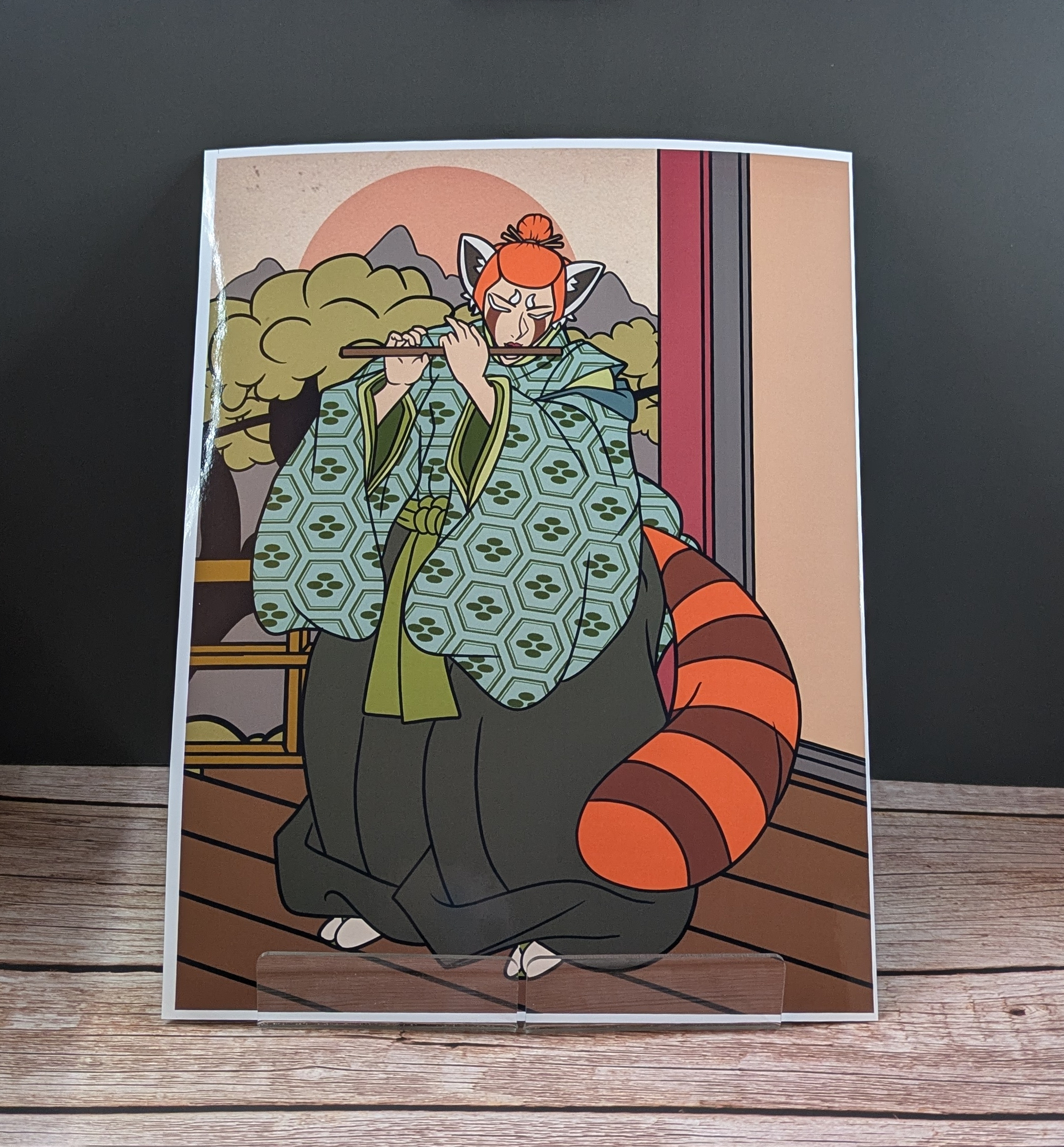 This enchanting 8.5 x 11″ print features a charming red panda man serenading on his flute, brought to life in a beautiful blend of Japanese watercolor and vintage anime styles. It’s a whimsical and artistic piece perfect for adding a touch of serene magic to any space.