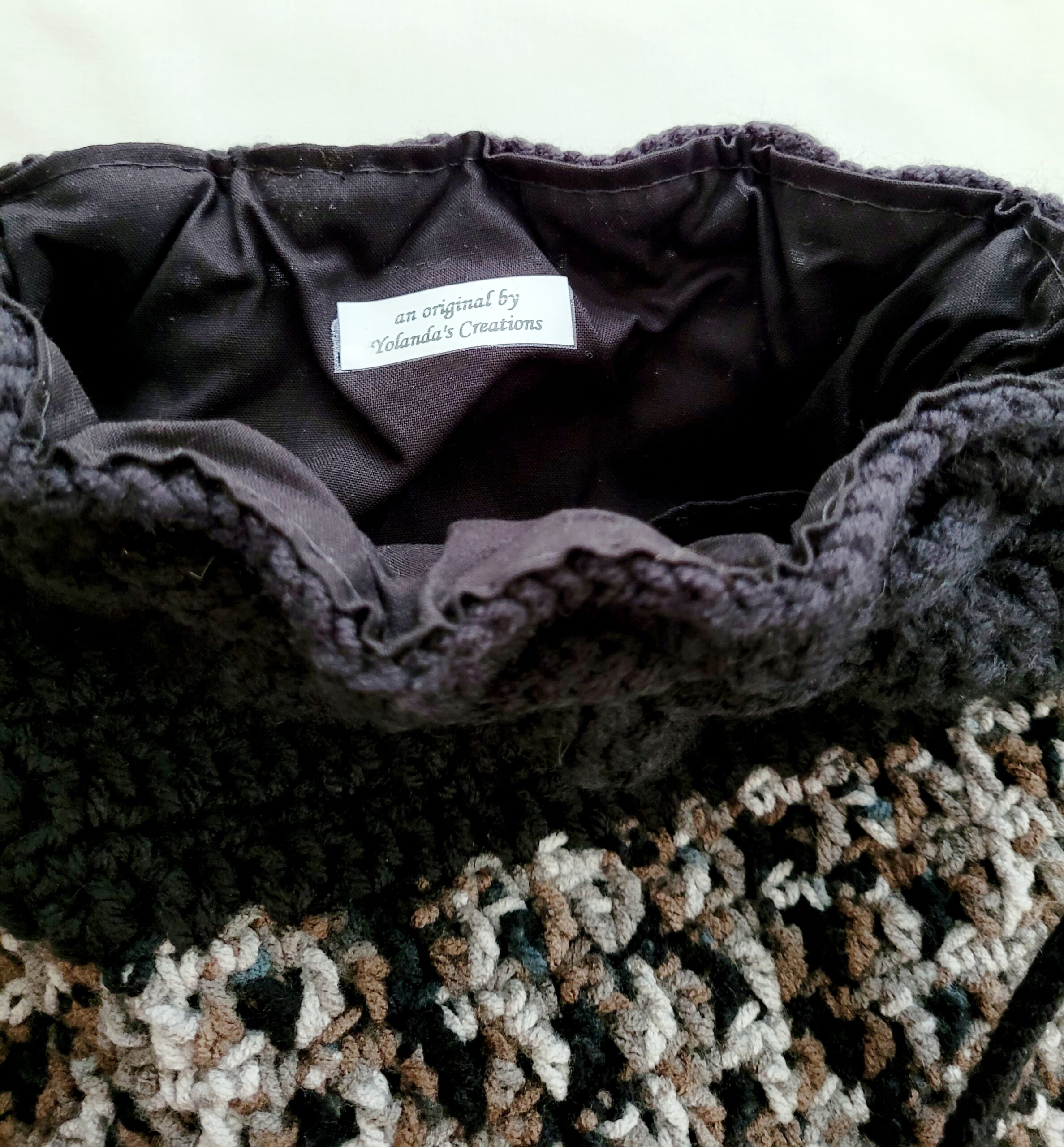 Materials: acrylic yarn, drawstring closure, cotton fabric, removable flower