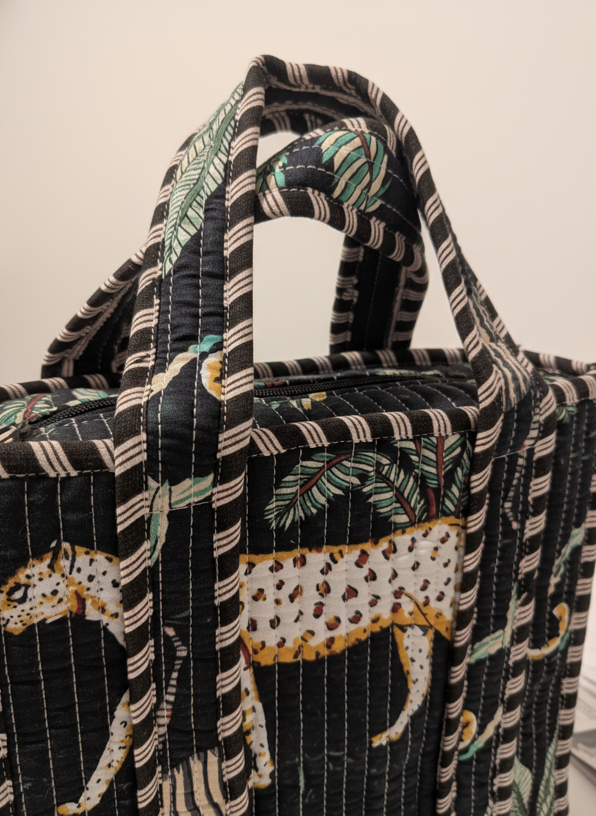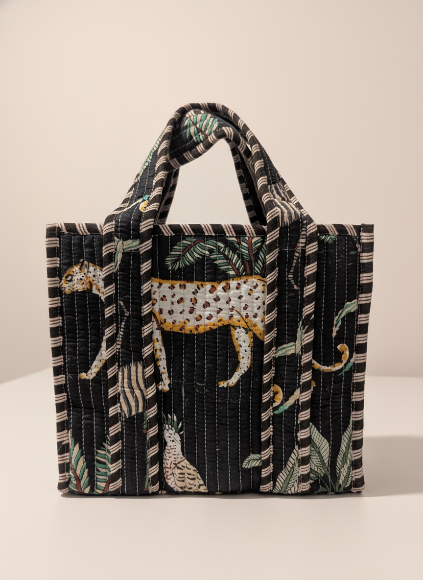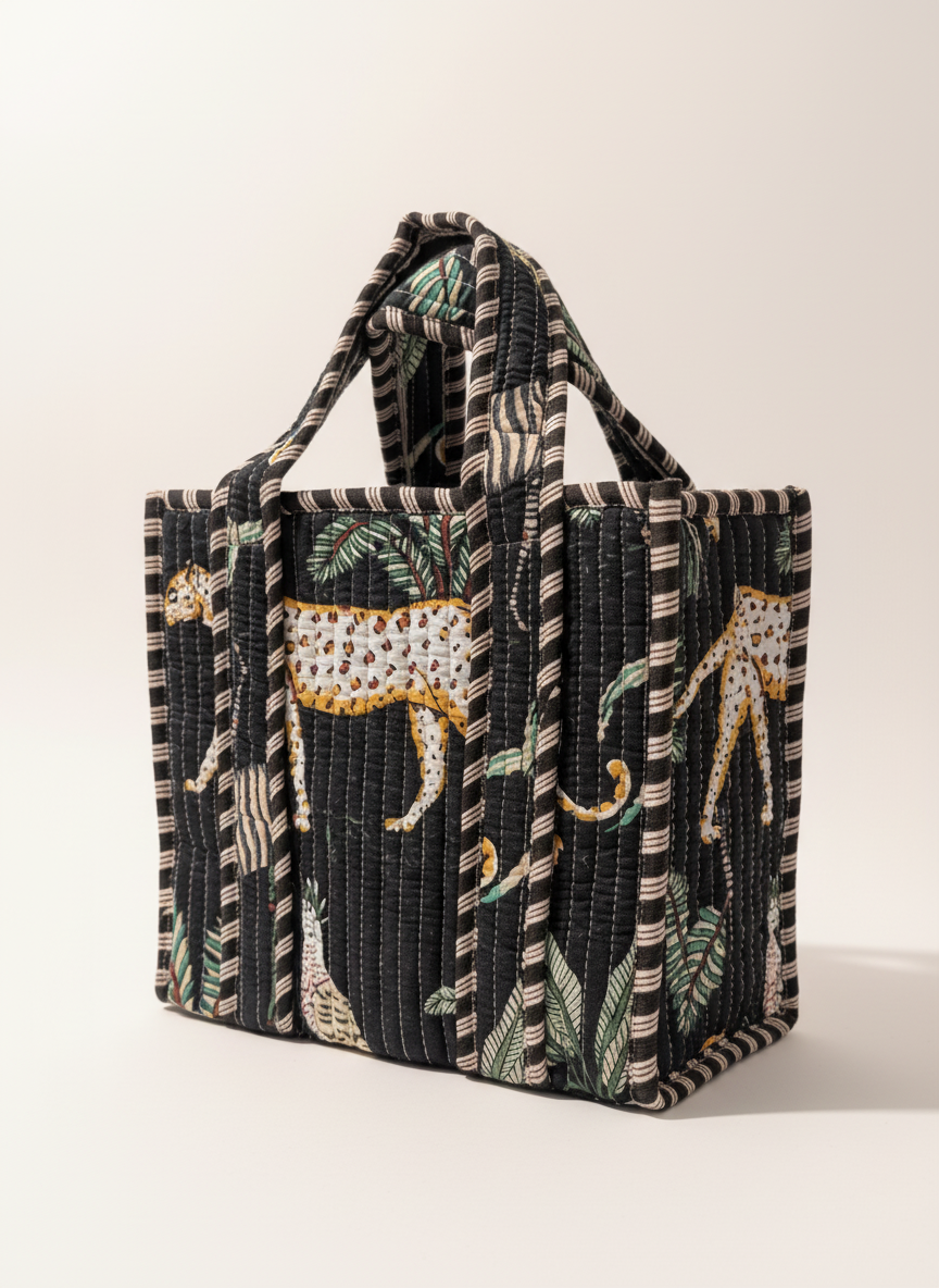 Elevate your daily routine with our Black Quilted Cotton Jungle Print Lunch Bag, a handcrafted piece from Draped In Heritage. This unique lunch bag brings a touch of wild elegance to your midday meal, transforming an everyday necessity into a statement of personal style. Each bag is a testament to thoughtful design, offering a beautiful way to carry your sustenance.