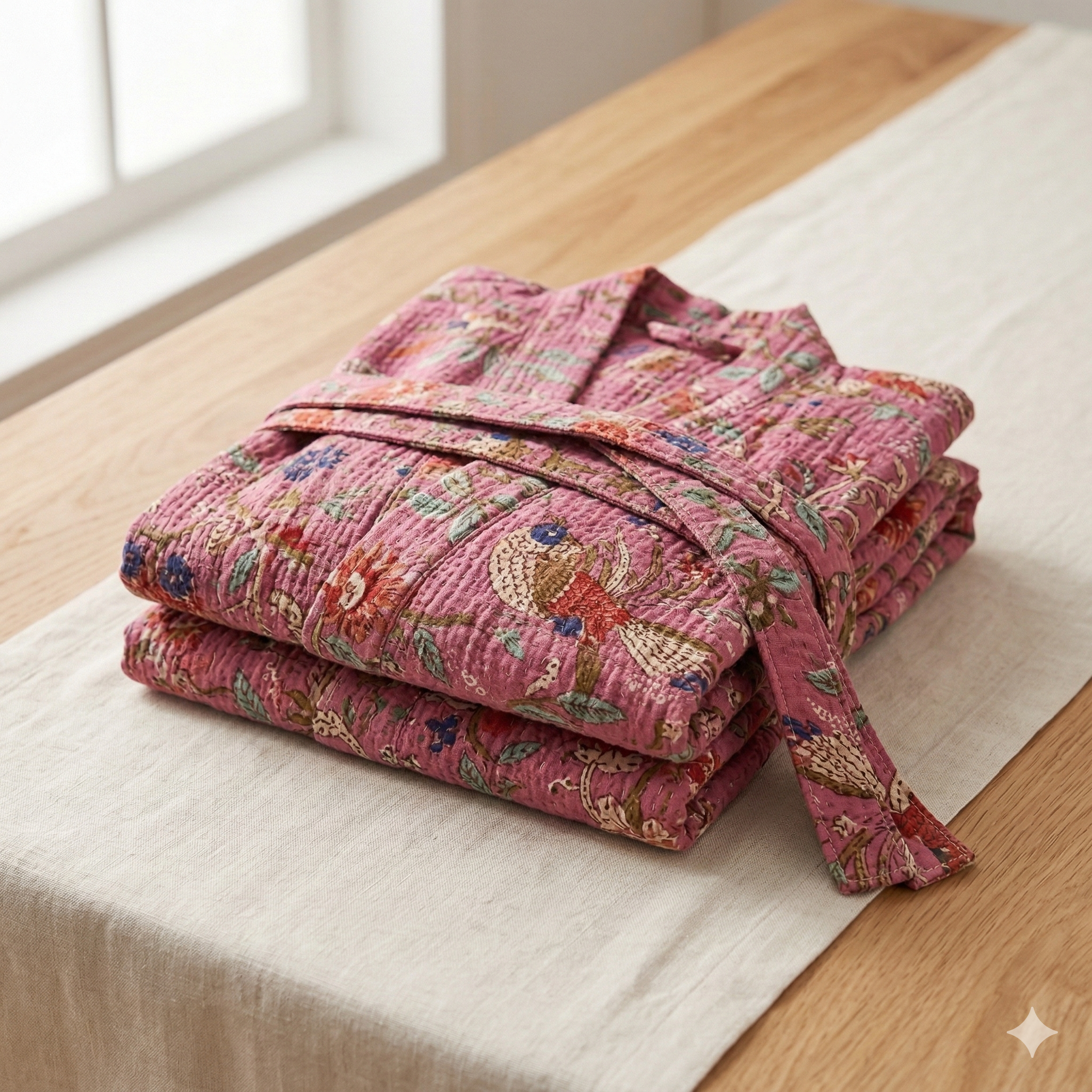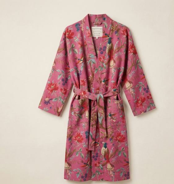 Wrap yourself in soft cotton waffle fabric that breathes beautifully year-round. The peacock garden in vivid colors block print brings artisan character to slow mornings with coffee, post-shower comfort, or a quiet evening at home. Lightweight enough to wear in summer, cozy enough for cooler months.
