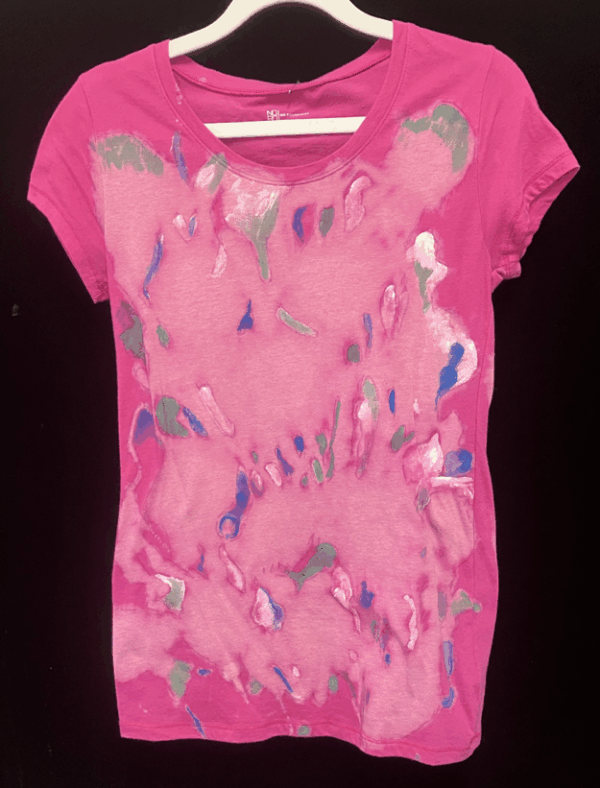This adventuresome refurbished T-shirt is a No Boundaries medium. The free form painting is machine washable.