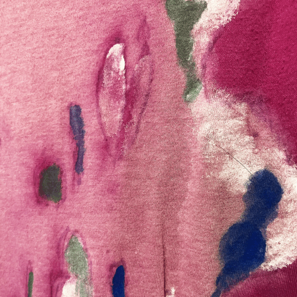 This adventuresome refurbished T-shirt is a No Boundaries medium. The free form fabric painting is machine washable. The imagery was inspired by Abstract Expressionism. Blue, white and green details.