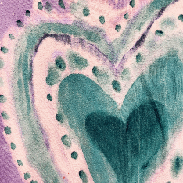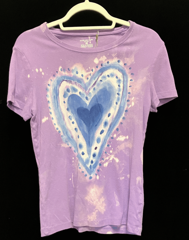 This medium Jones New York T-shirt has been refurbished with bleach and fabric paint to create a joyful piece of clothing. The nested hearts reminds us that love wins.