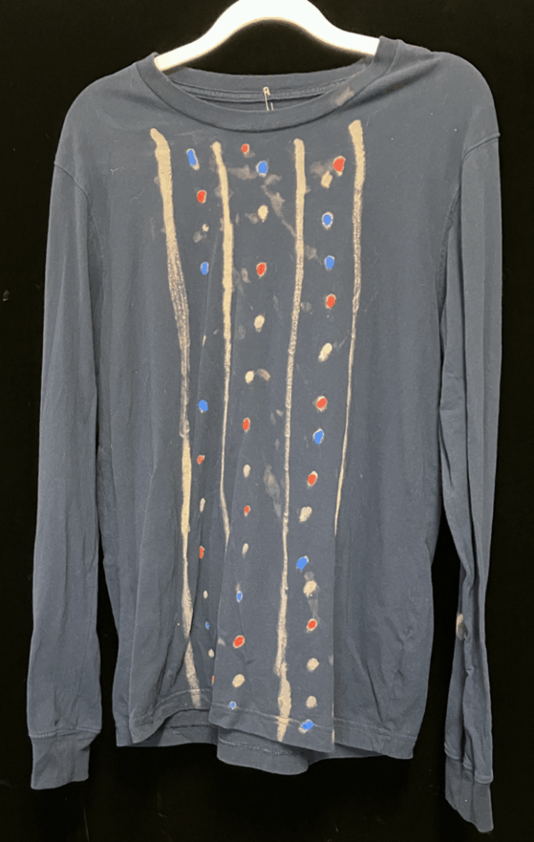 This soft black long sleeve top is adorned with loose rows & spots done in fabric paint. A George brand it is a size medium. Joyful, it evokes holiday lights.