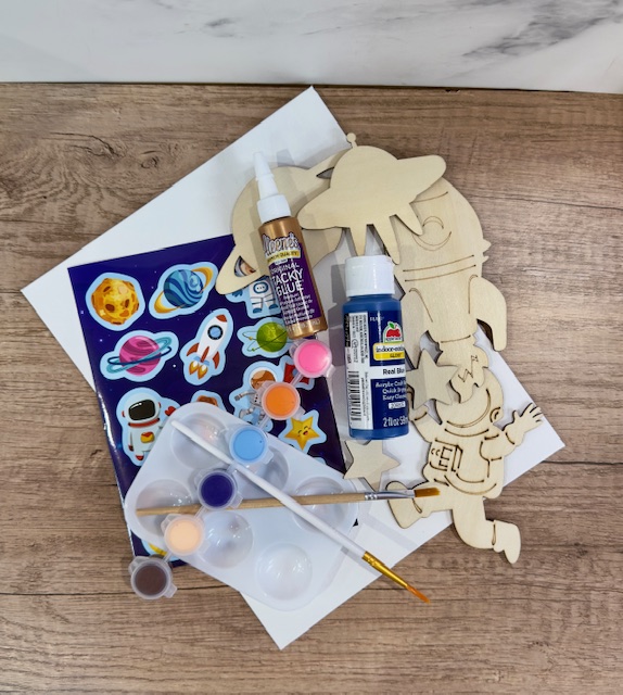 This craft kit is out of this world! Create your own dimensional painting using fun space themed wood cutouts, paint, and stickers. Once all the pieces dry you’ll assemble them onto the included background.