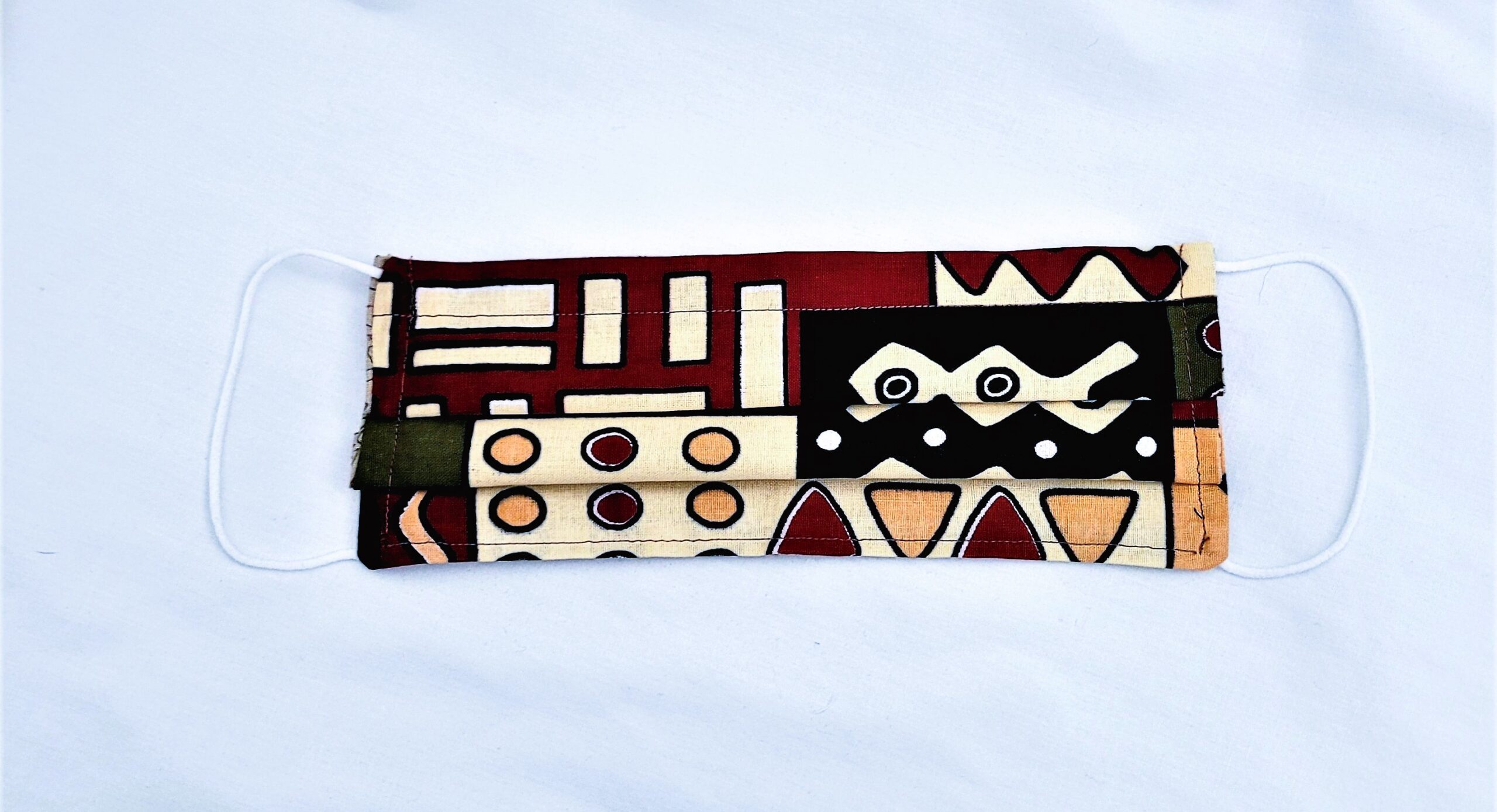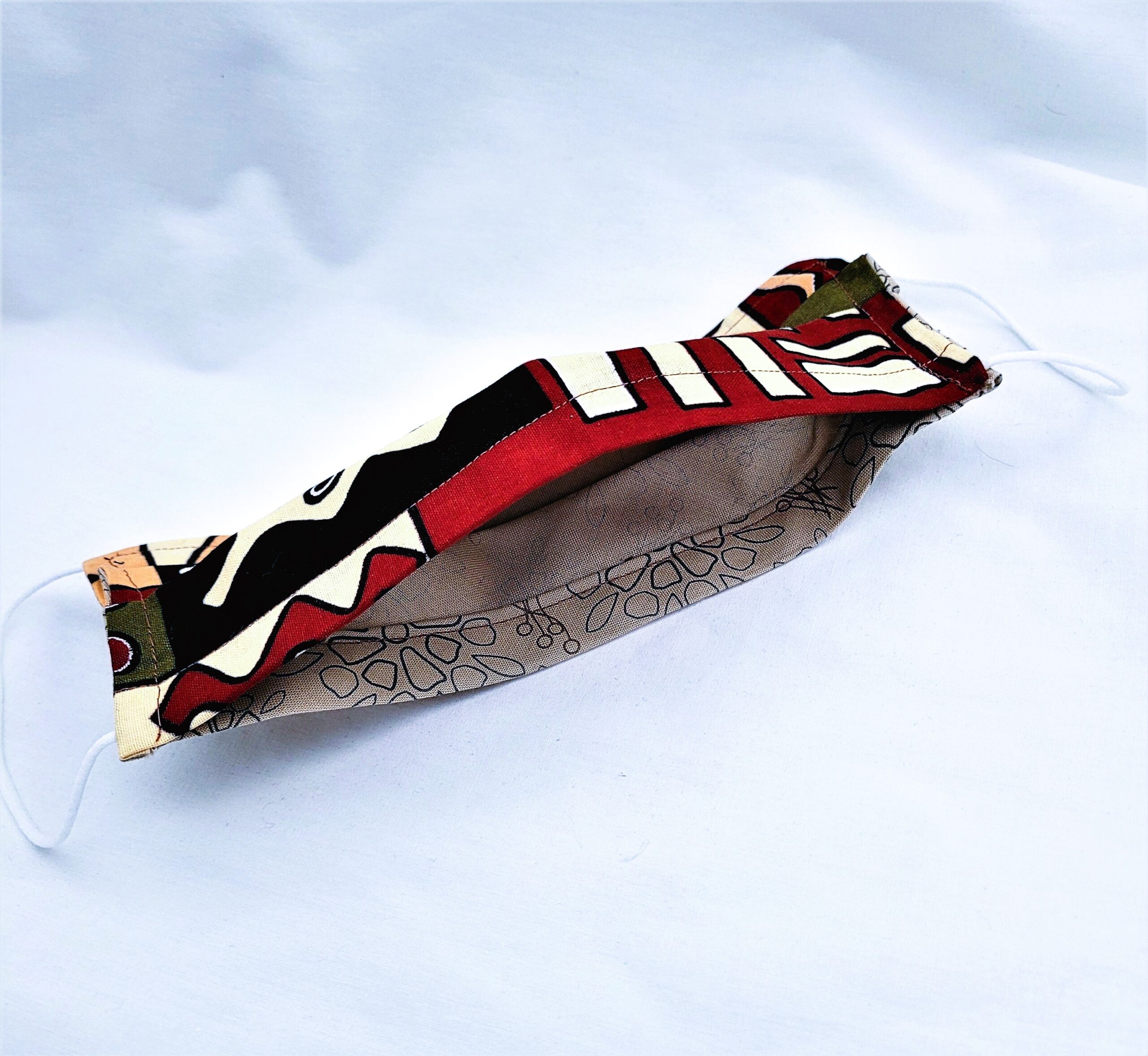 This is a reusable 2-layer cloth face mask, handmade from 100% cotton fabric. It features a filter pocket opening at the top, lined in a complementary fabric. Comfortable elastic ear loops help provide a secure and flexible fit.