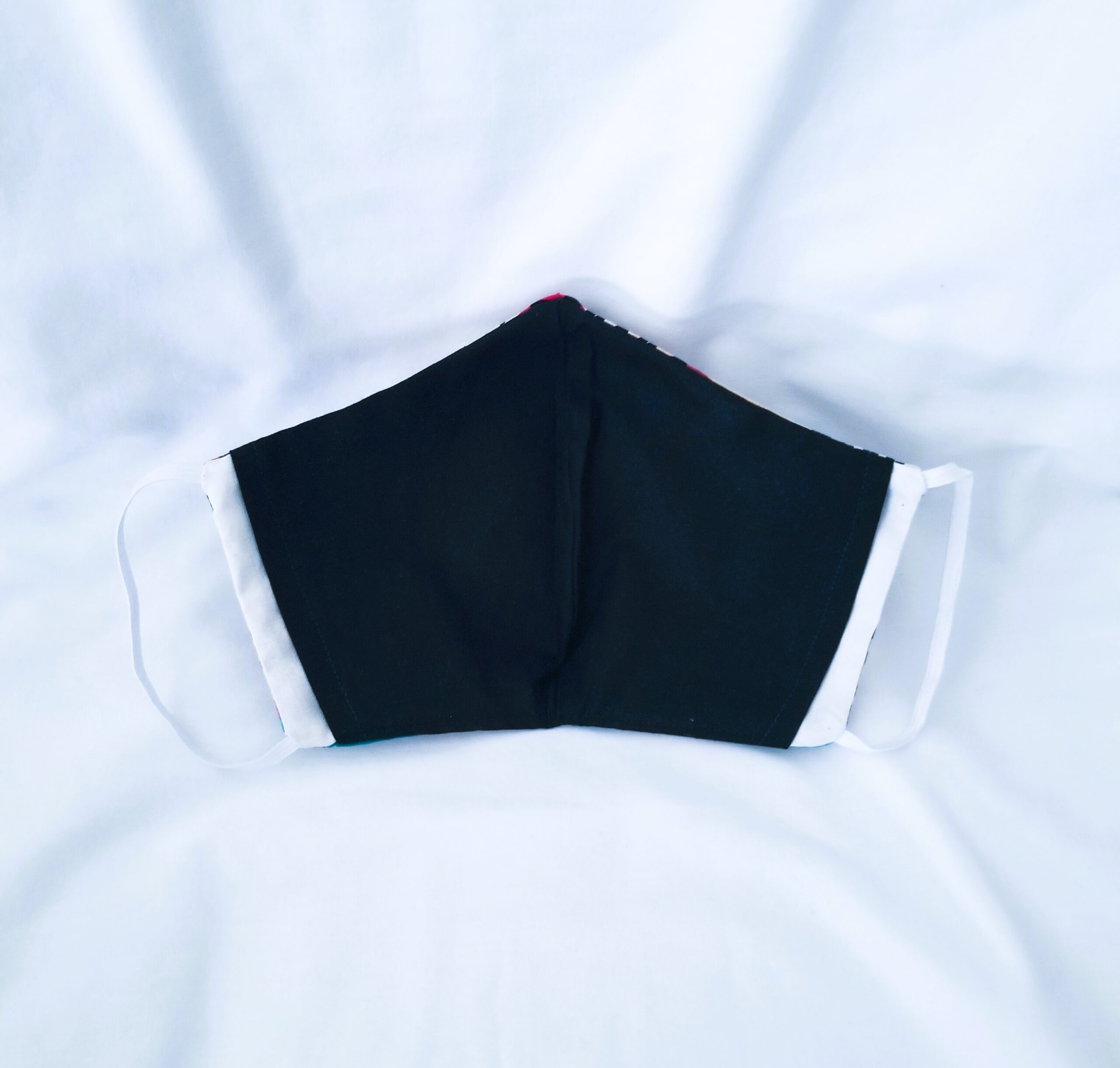 This is a reusable 3-layer cloth face mask, handmade from 100% cotton fabric. It features a filter pocket opening in the back, lined in a complementary fabric. Comfortable elastic ear loops help provide a secure and flexible fit.