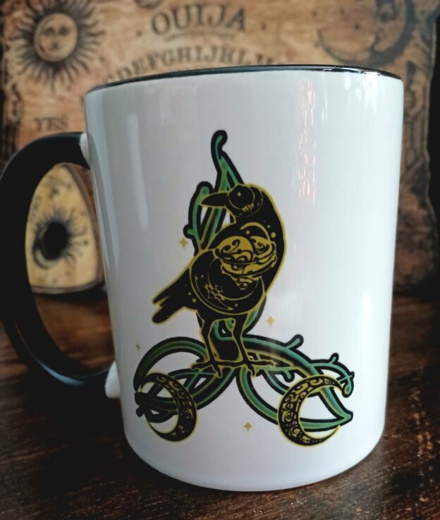 Beautiful Celtic raven design in front of triquetra with gold highlights crescent moon and stars