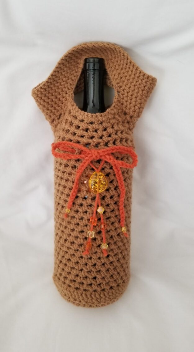 Crochet Gift Bag – Tan Brown with Orange Crochet Beaded Tie