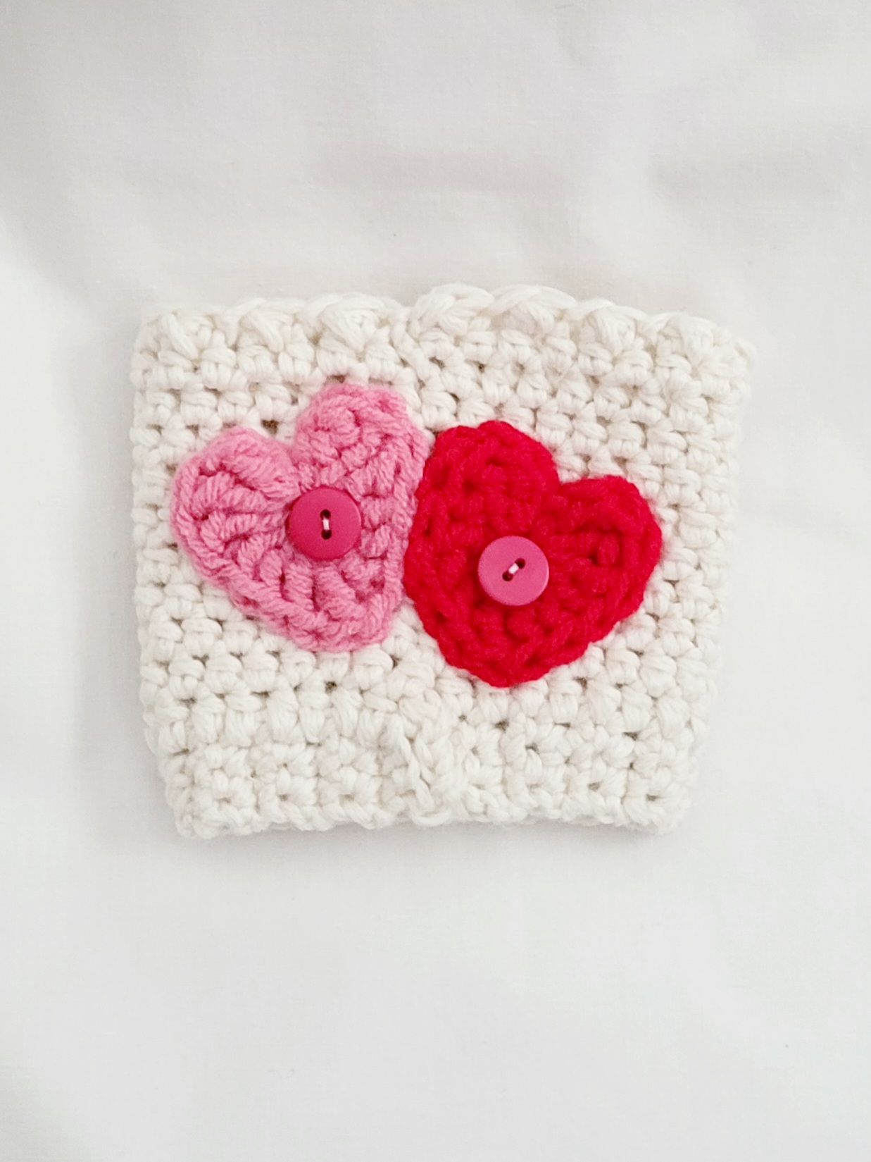 Coffee Cup Sleeve – Crochet Reusable Cup Cozy – Cream with Pink and Red Hearts