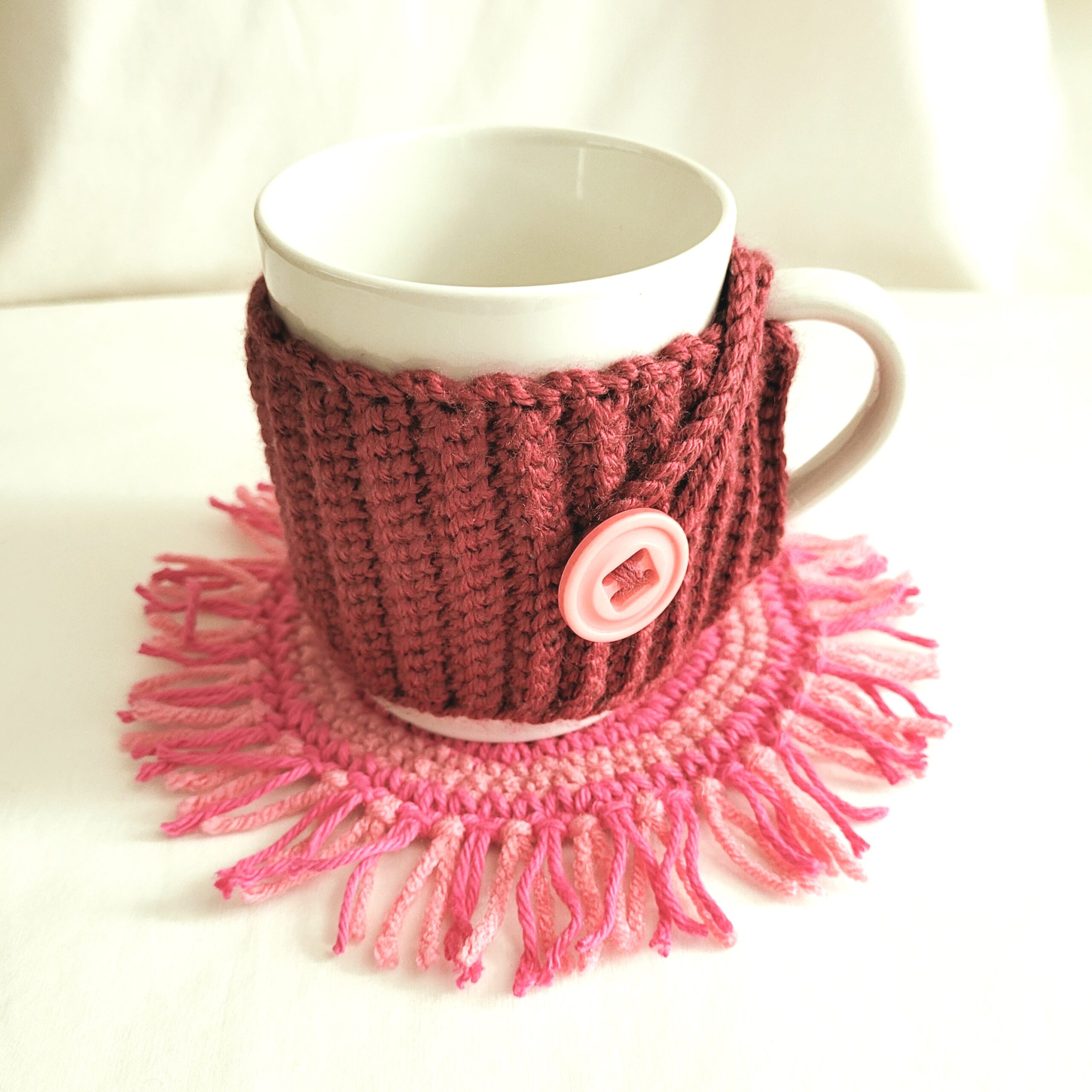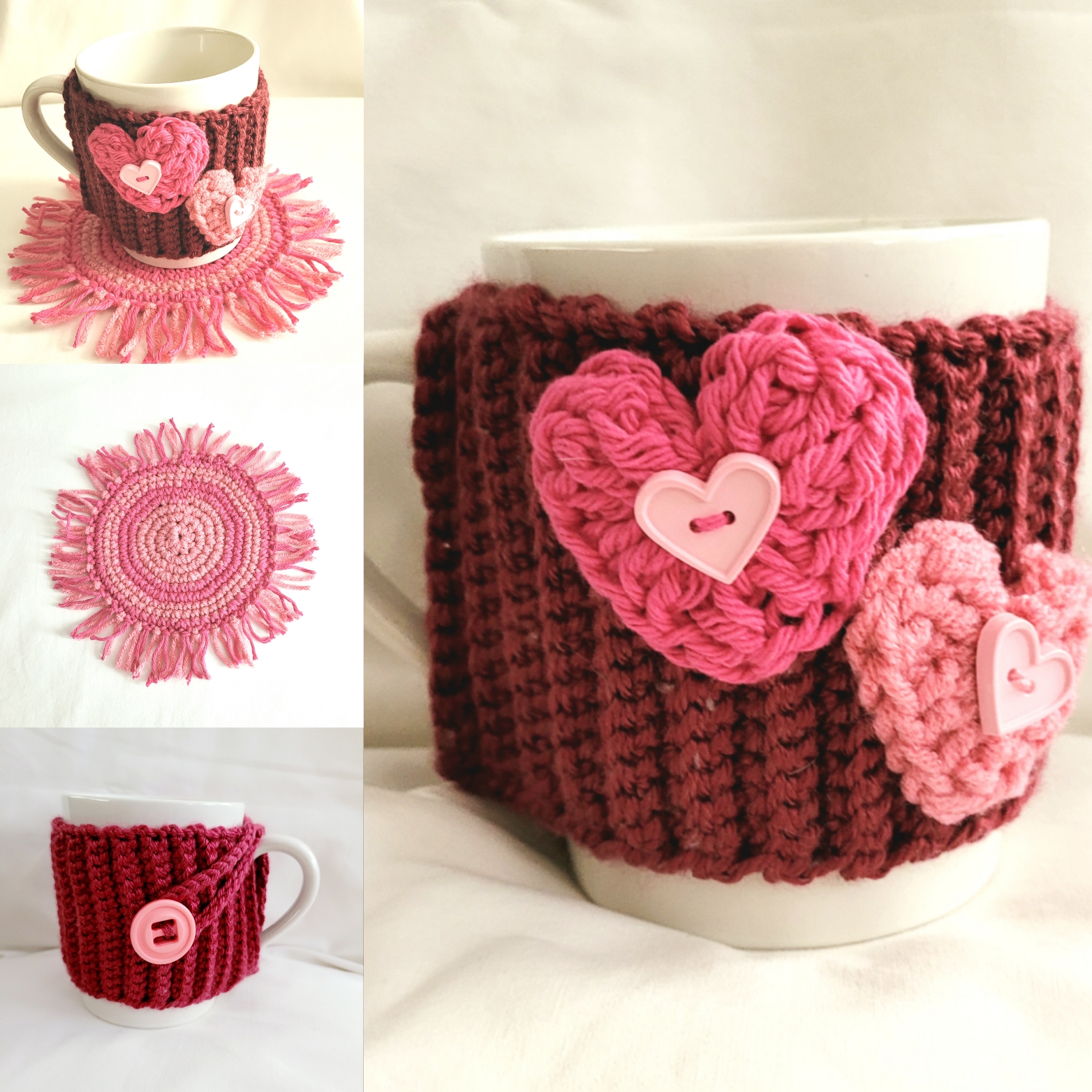 Coffee Cup Sleeve – Crochet Reusable Cup Cozy – Burgundy Pink Hearts with Mug Rug