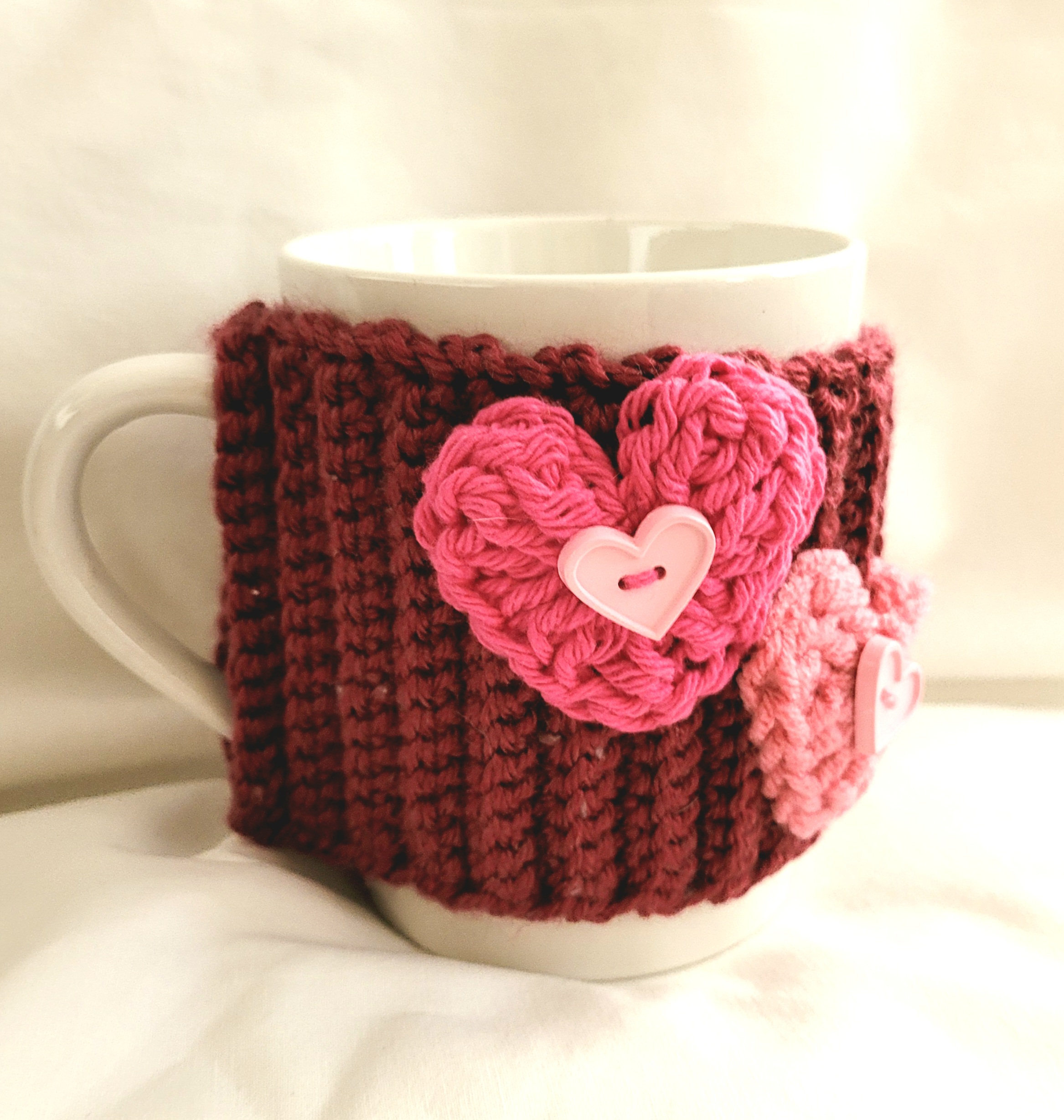 Be the first to review “Coffee Cup Sleeve – Crochet Reusable Cup Cozy – Burgundy Pink Hearts with Mug Rug” Cancel reply