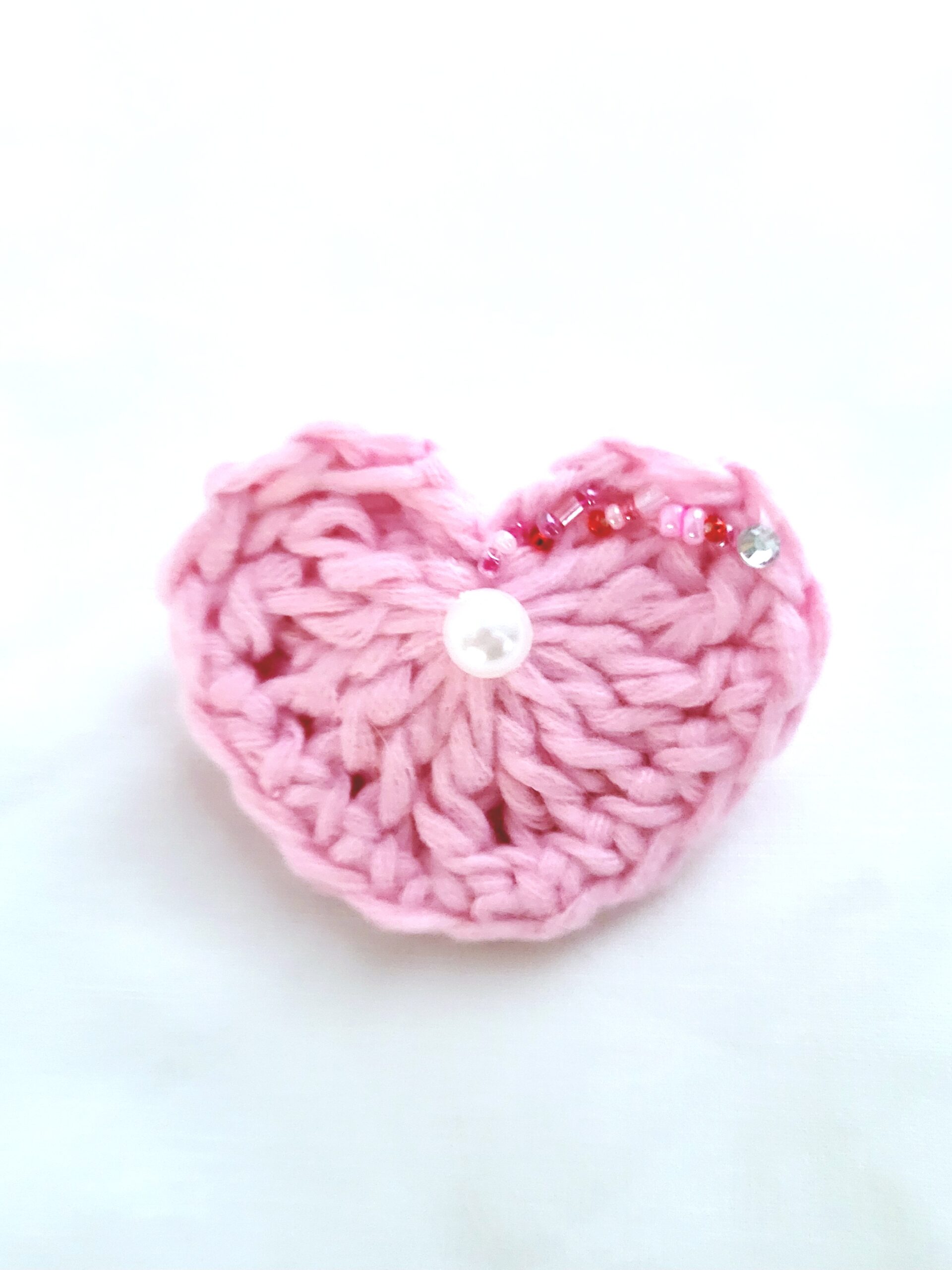 Crochet Brooch Pin – Heart, Pink with Pearl & Beads