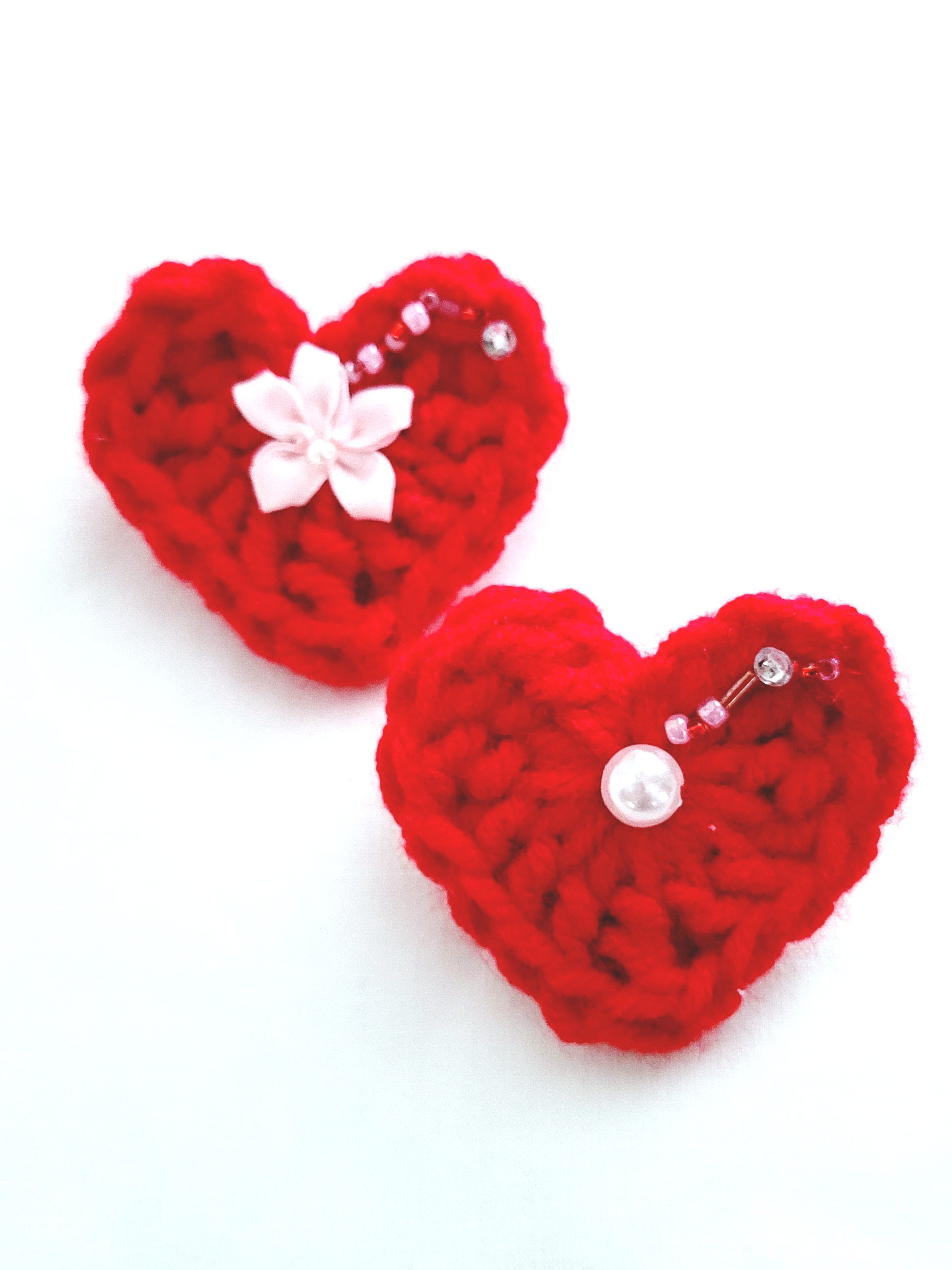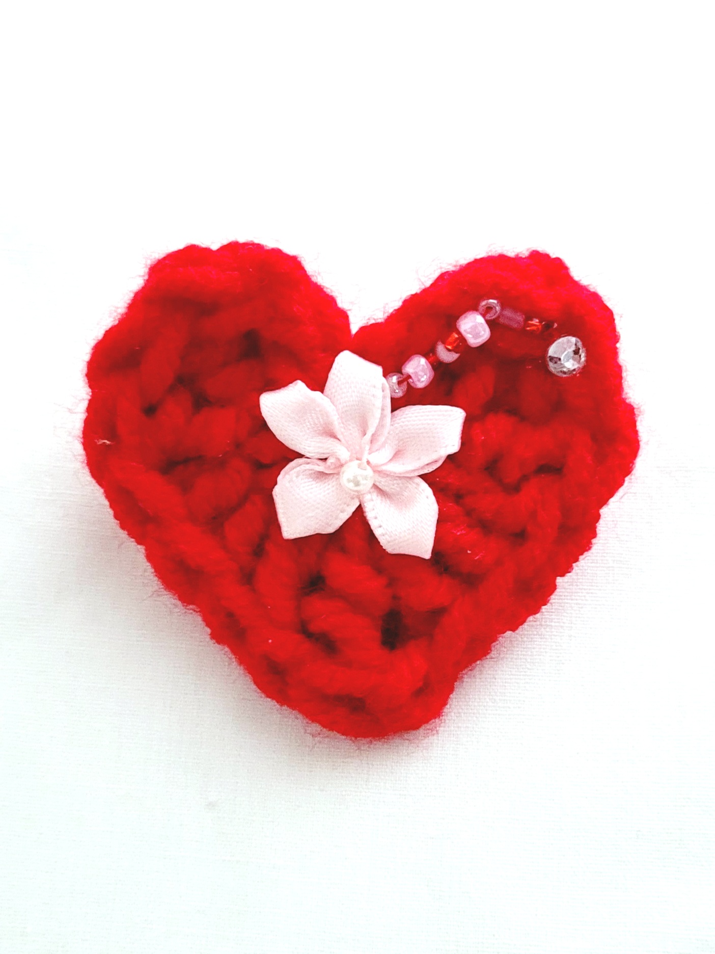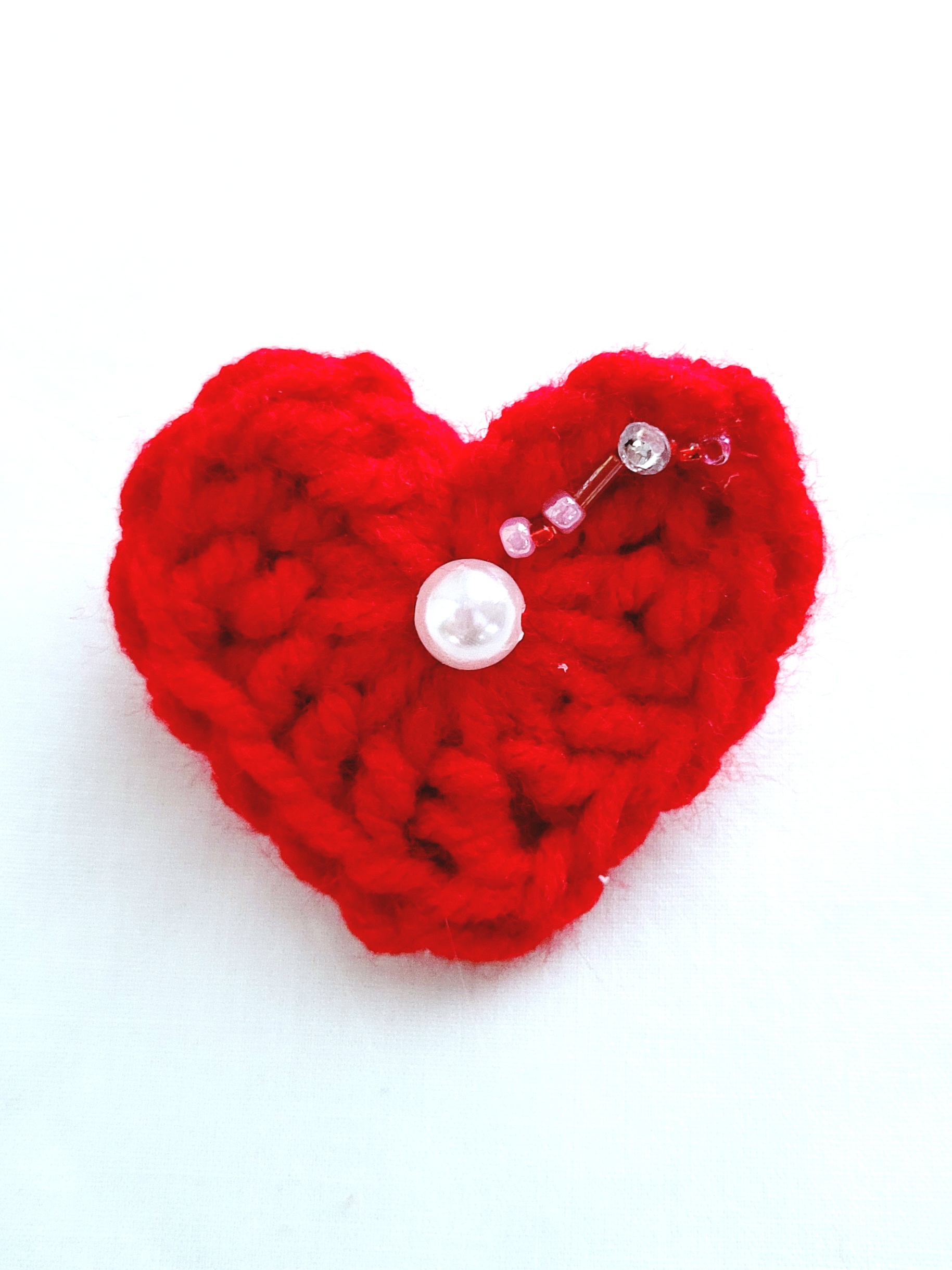 Crochet Brooch Pin – Heart, Red with Beads – Set