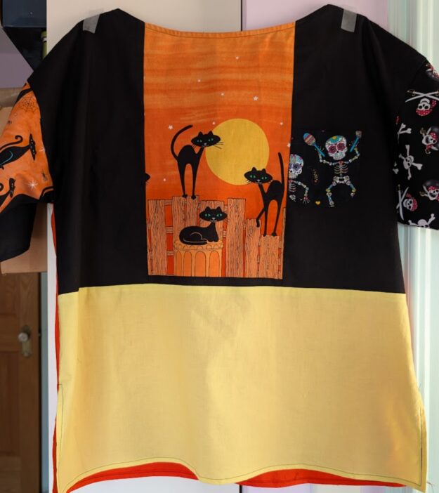 Adult Halloween Blouse, Size Large. This one-of-a-kind blouse is made of several coordinating fabrics with cats, skeletons, and skulls appropriate for scaring anyone you come in contact with.