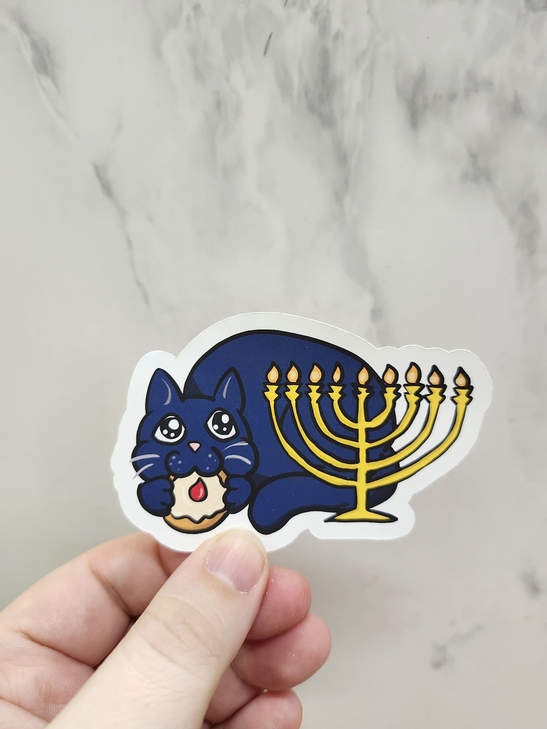 Cat Eating Sufganiyot Donut Hanukkah Menorah Vinyl Stickers 3″