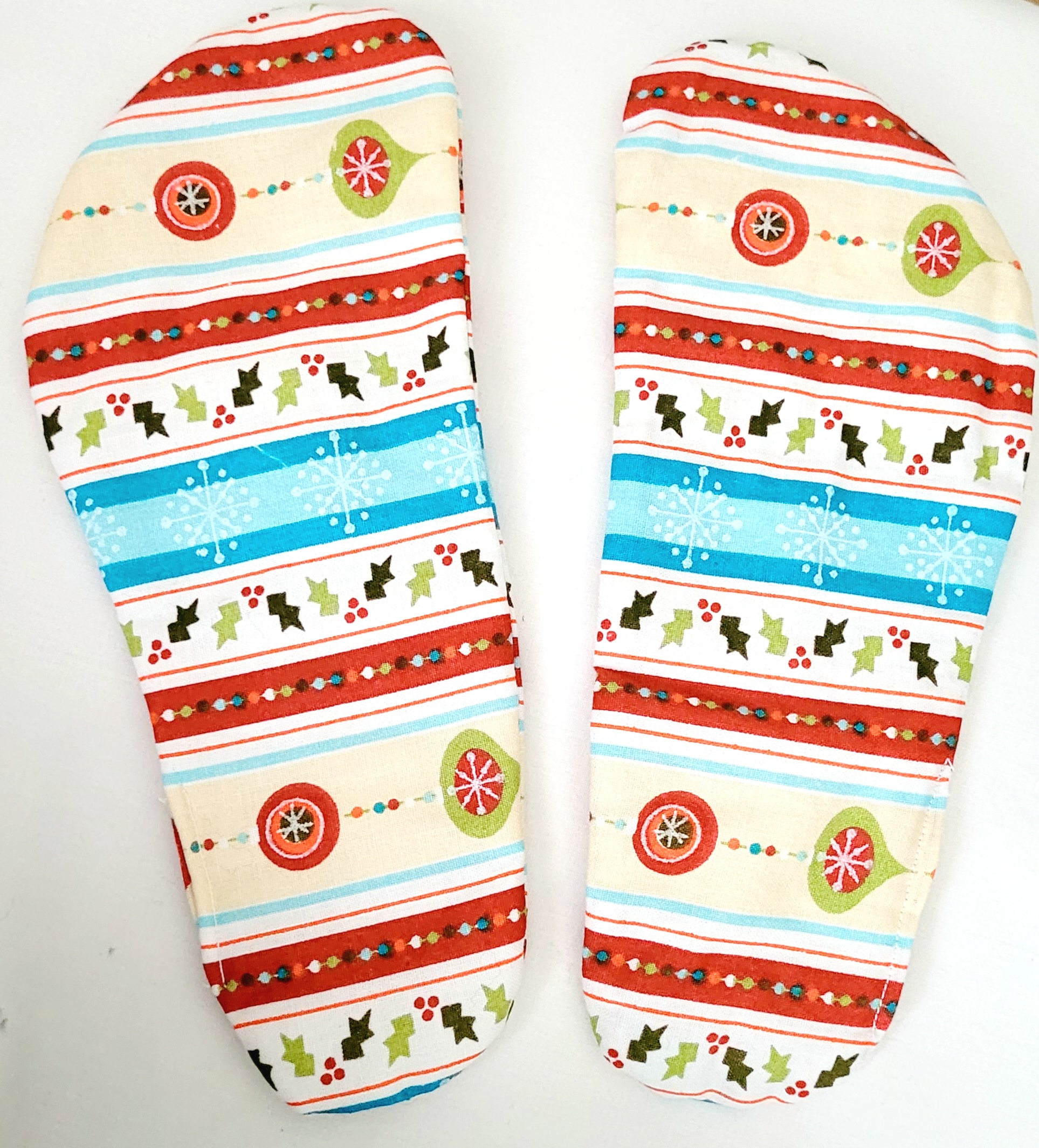 If you are giving these to someone or buying them for yourself, please know that these can be slippery on tile, wood or smooth floors. I also recommend not allowing your pets to chew on it. Even though I am using non-toxic fabric paint on the bottom I do not recommend pets to chew on these slippers.
