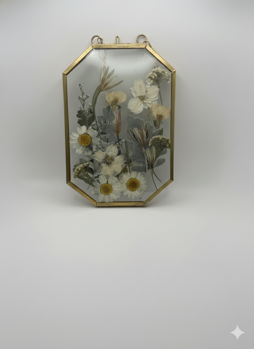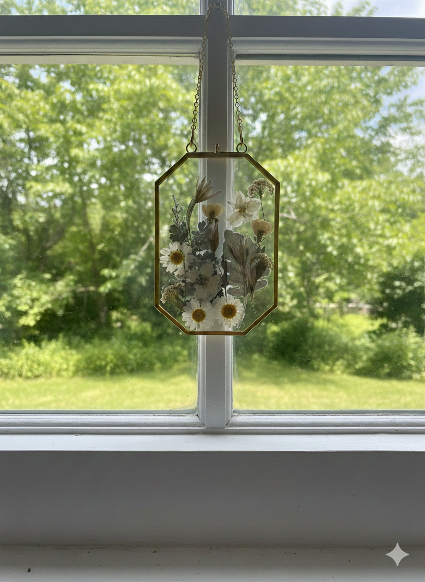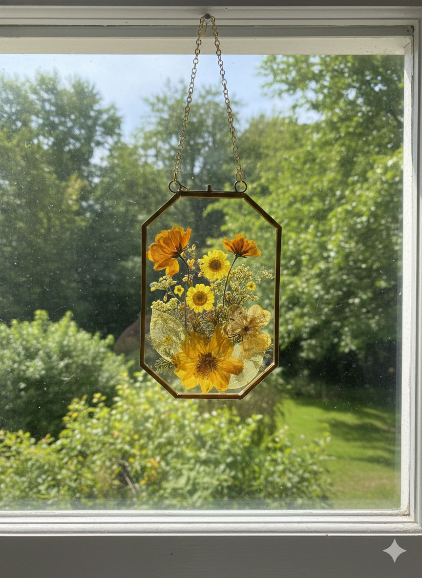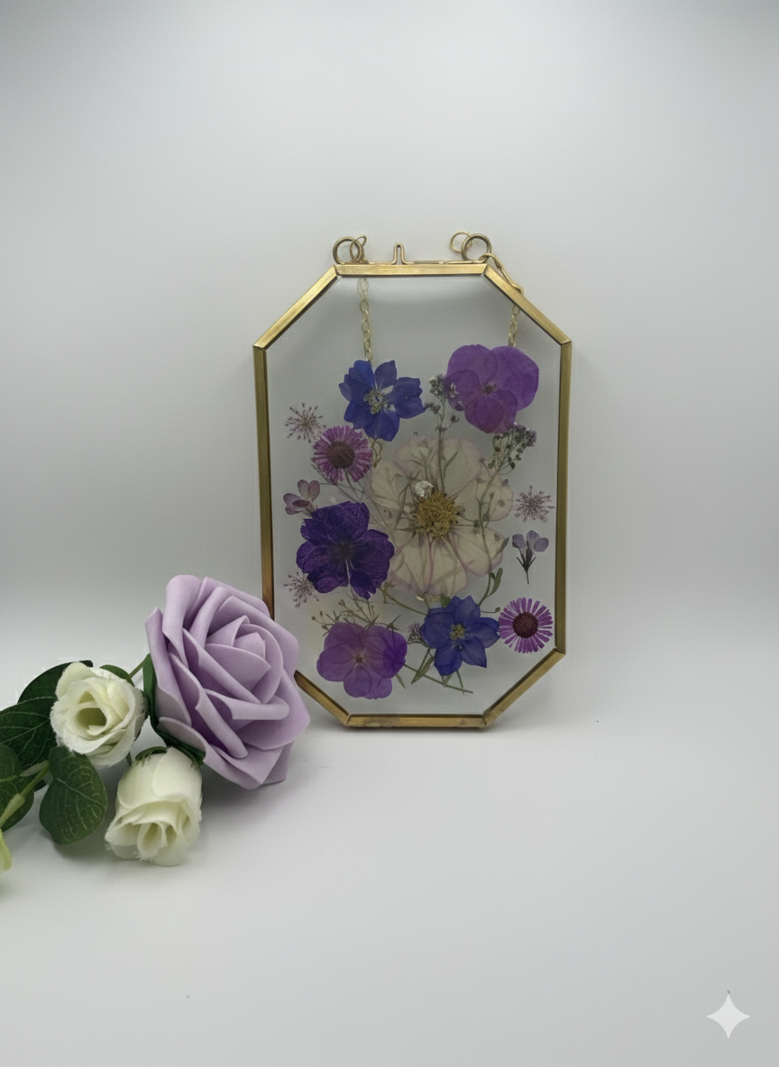 These handcrafted pressed flower glass frames are a delicate way to bring nature indoors. Each piece features real dried flowers carefully arranged and preserved between two clear glass panes, framed in a classic metal edge and finished with a hanging chain for easy display.