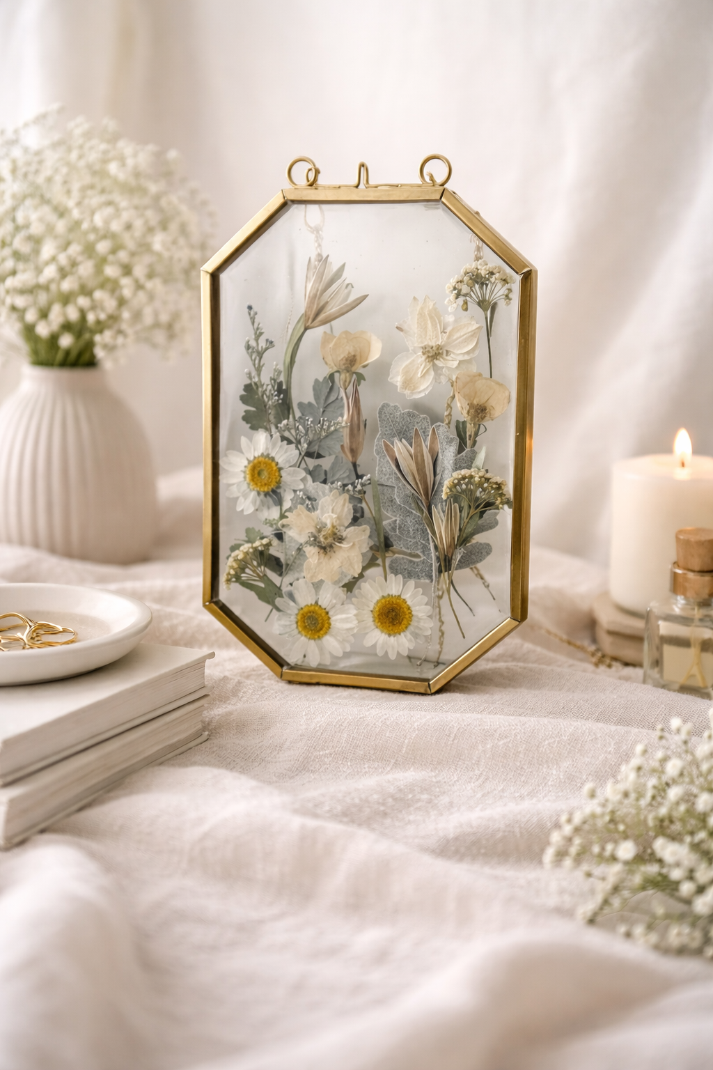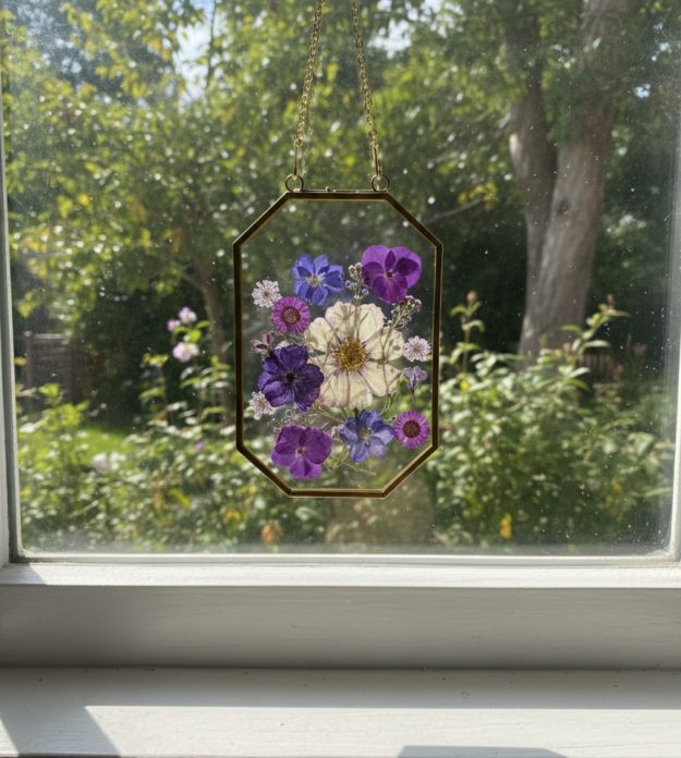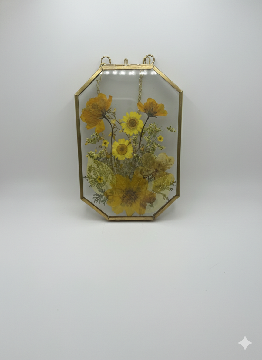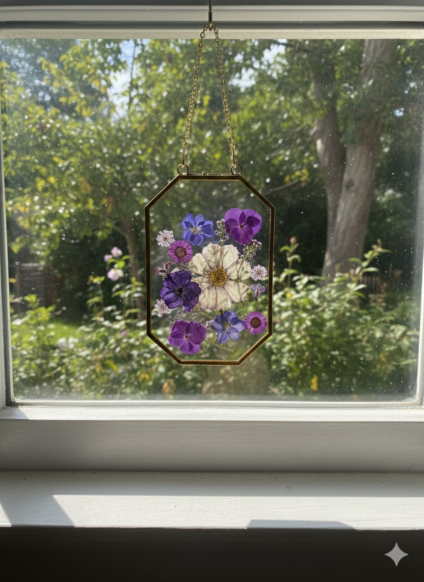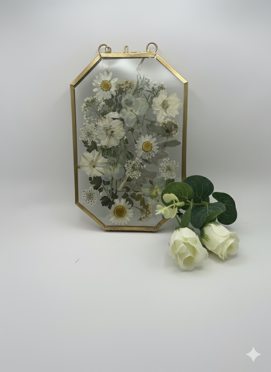 These handcrafted pressed flower glass frames are a delicate way to bring nature indoors. Each piece features real dried flowers carefully arranged and preserved between two clear glass panes, framed in a classic metal edge and finished with a hanging chain for easy display.