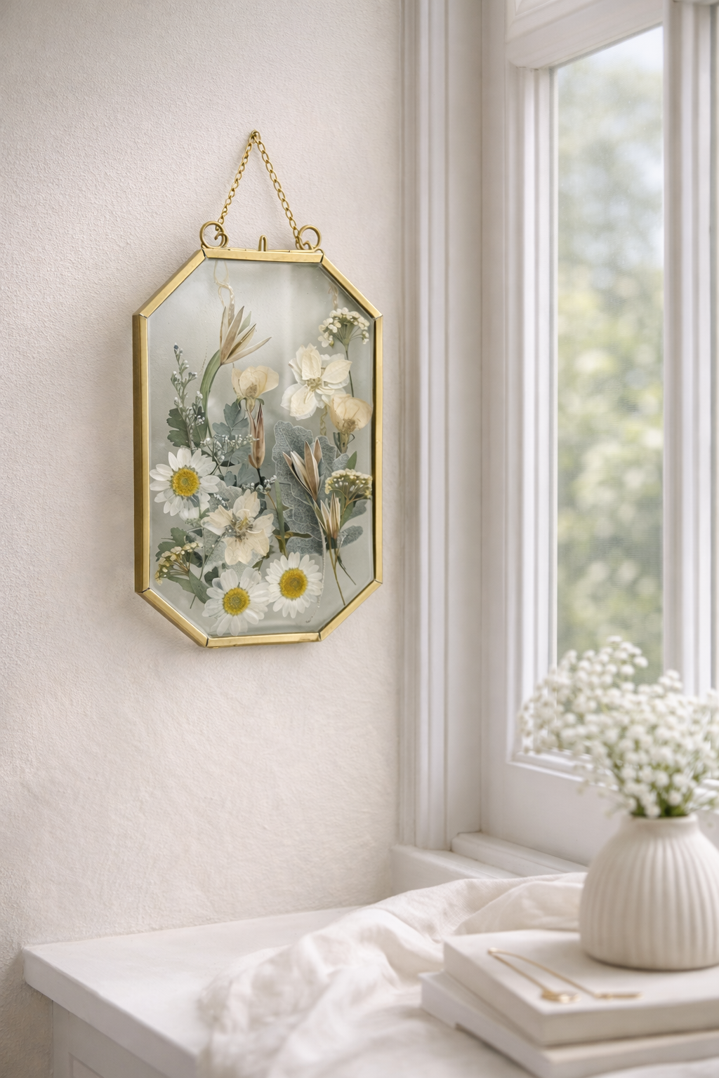 Designed to catch natural light beautifully, these frames look stunning when hung on a wall, near a window, or styled on a shelf or tabletop. Each arrangement is made by hand, giving every piece its own unique character and floral composition.