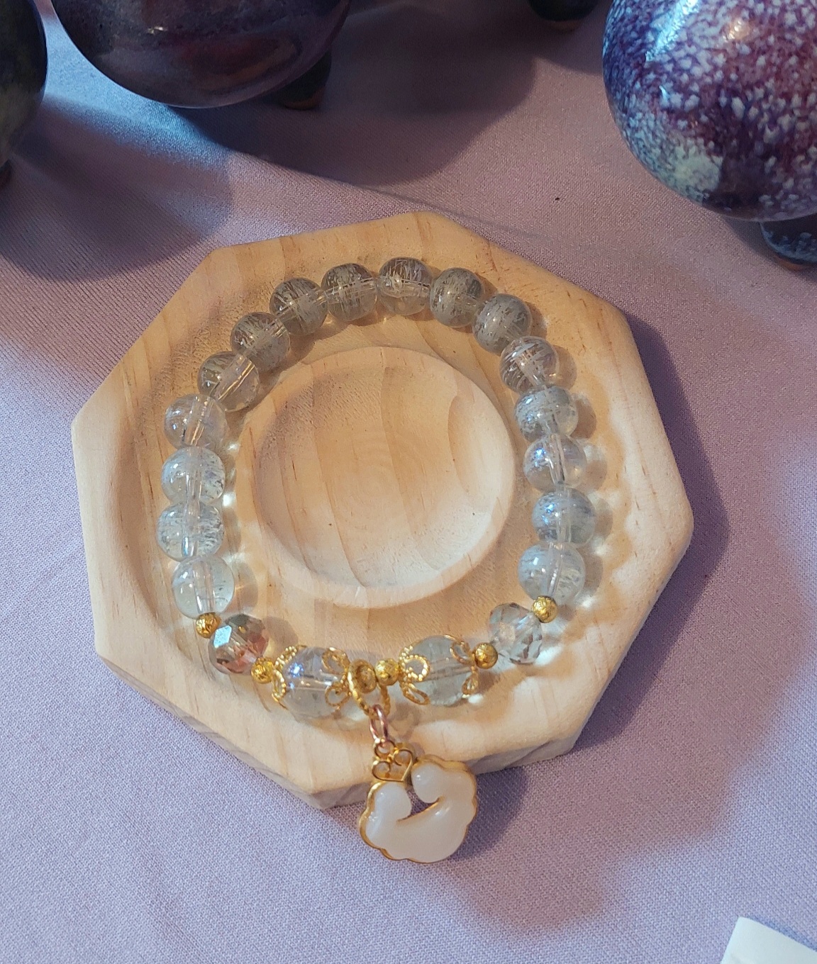 Clear glass beads with white striped design, metal faux jade auspicious moon charm, made with elastic string (10mm beads)