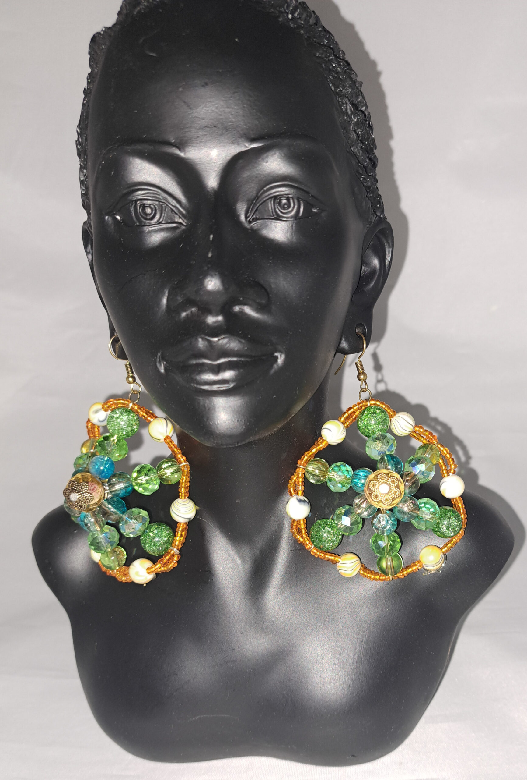 Vibrant handmade hoops featuring green glass beads, ivory accents, and a golden floral center. A bold bloom of natural beauty.