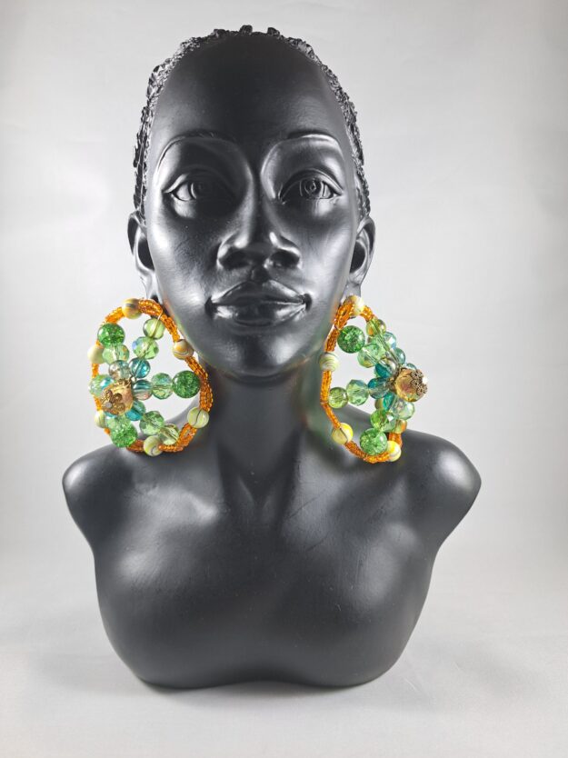 Make a statement with the Emerald Garden Hoops. Bold, handcrafted earrings inspired by nature’s lush vibrance. Designed with a radiant burst of green glass beads, soft ivory accents, and intricate golden centers, these earrings bloom with earthy elegance. Framed in a warm amber-gold beaded circle, each pair carries an organic, floral-like arrangement that feels both grounded and glamorous. Perfect for those who love color, confidence, and conversation-starter styles.