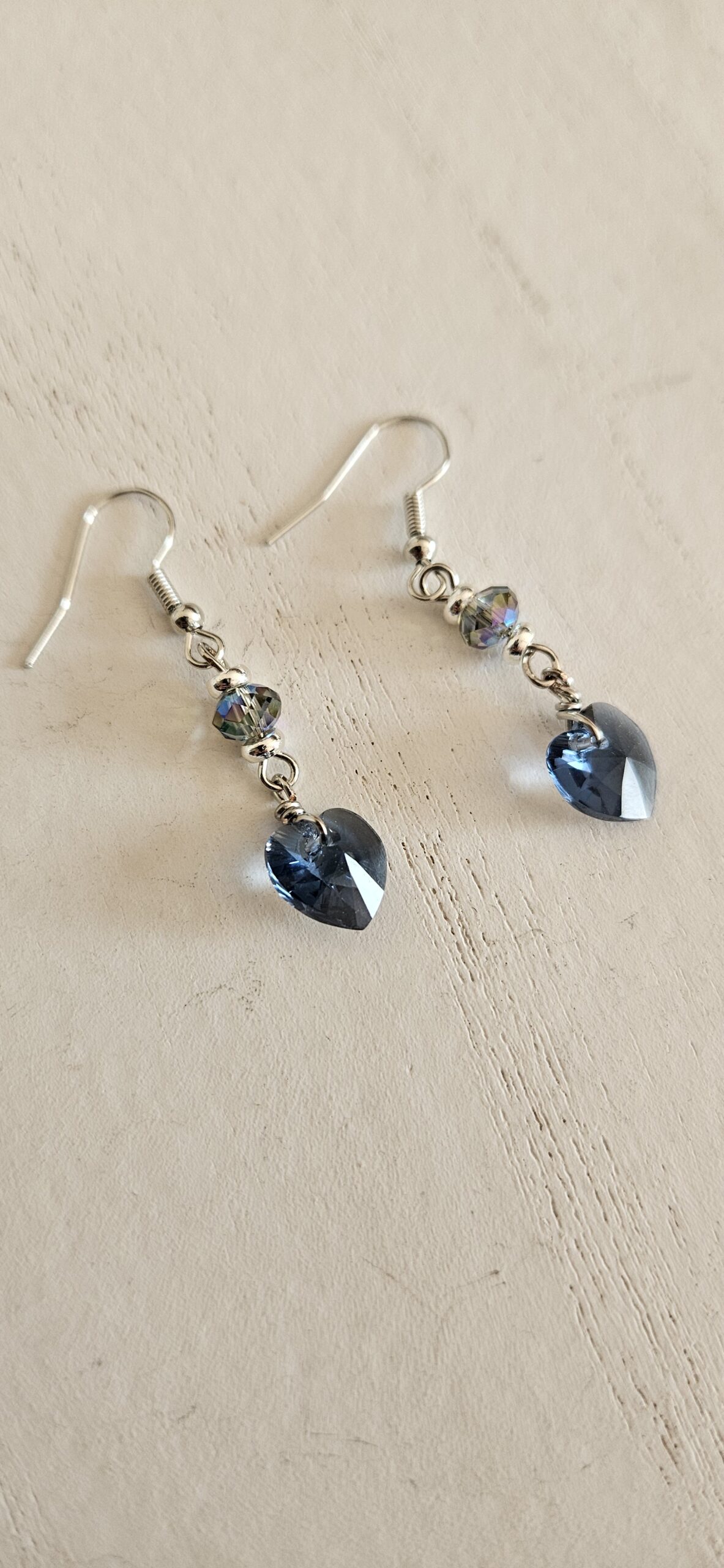 Handmade Earrings made using round, sparkly blue Swarovski Crystal beads and Crystal Passions blue hearts. Stainless Steel hook earrings and hypo-allergenic, as well as hand manipulated wire connections. Cute. Trendy.