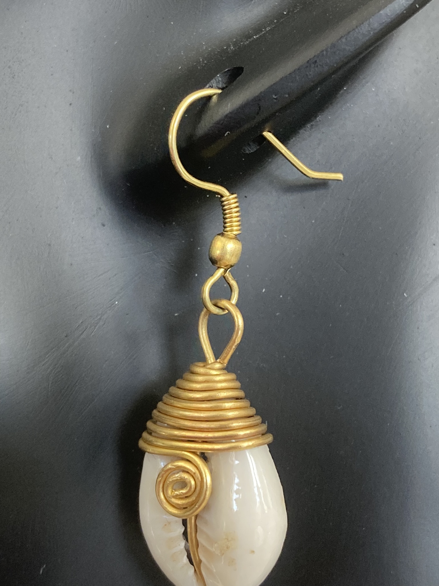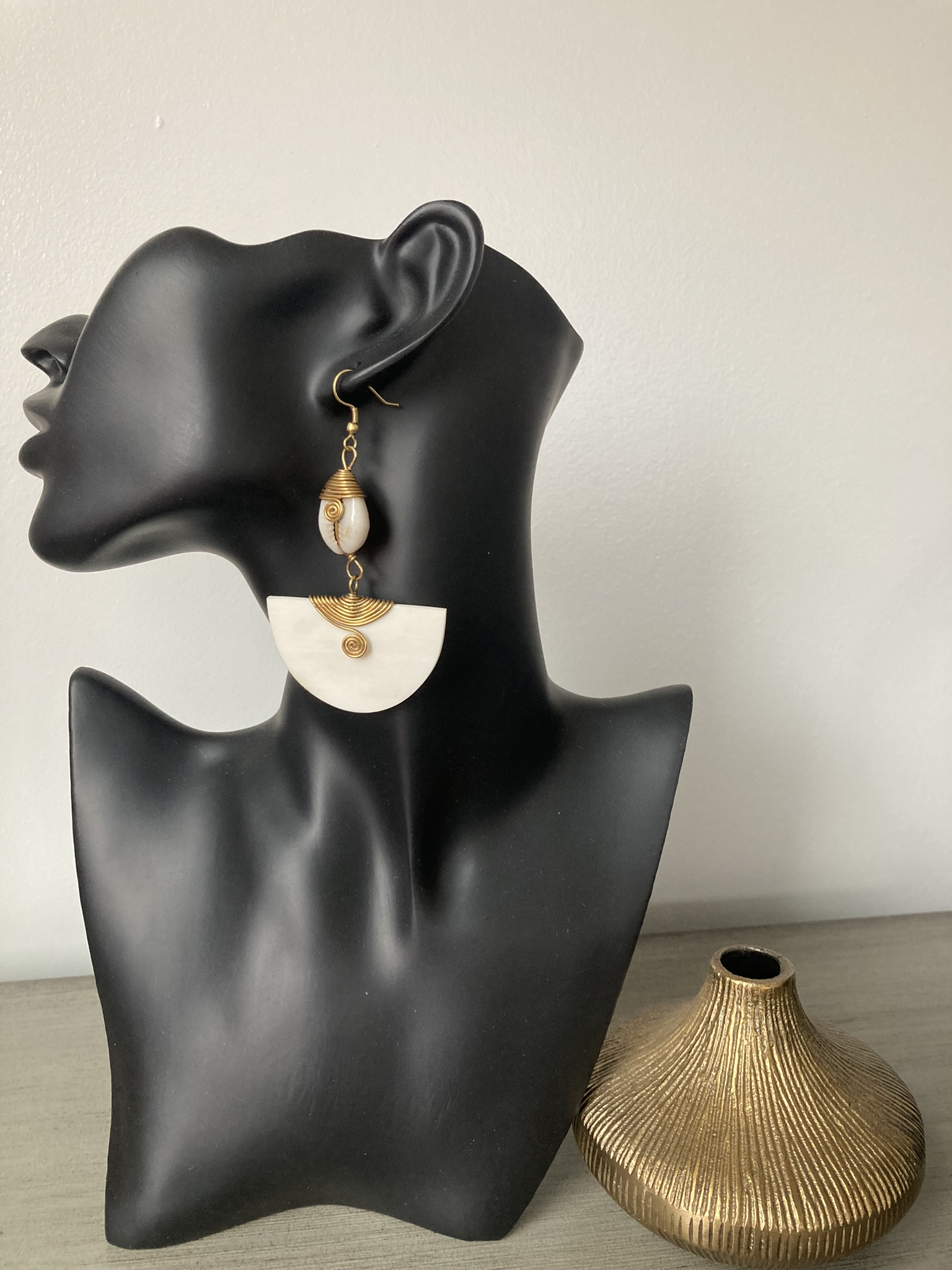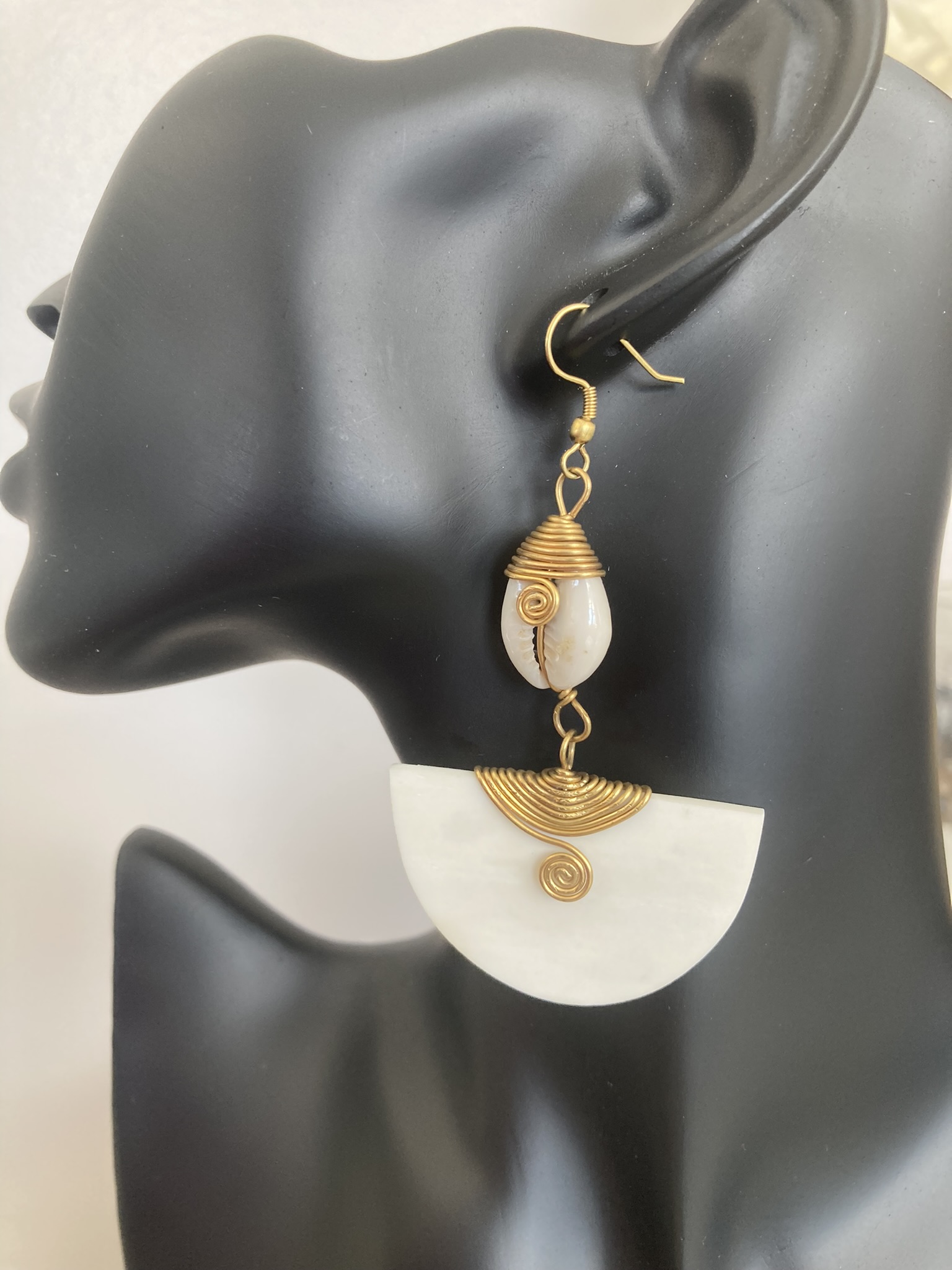 Featuring a delicate cowrie shell wrapped in gold-tone wire, paired with a smooth bone half-moon pendant, these earrings exude a sense of harmony and sophistication. The spiral details bring a touch of artistry, making these earrings perfect for adding a unique flair to any ensemble, no matter the season.