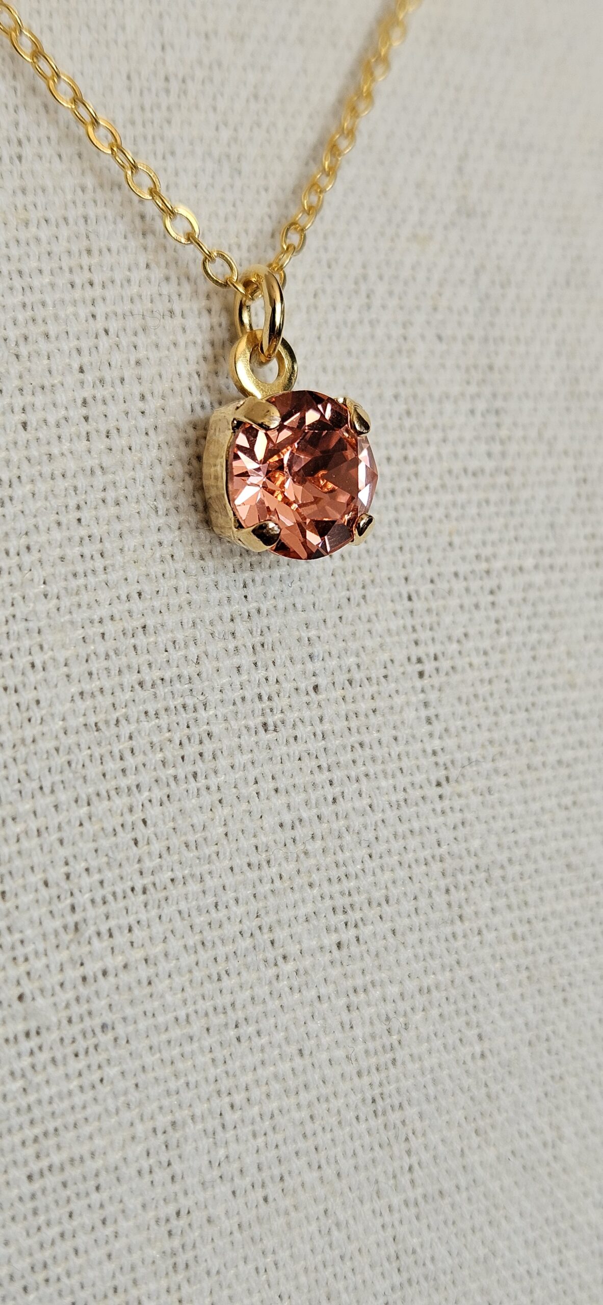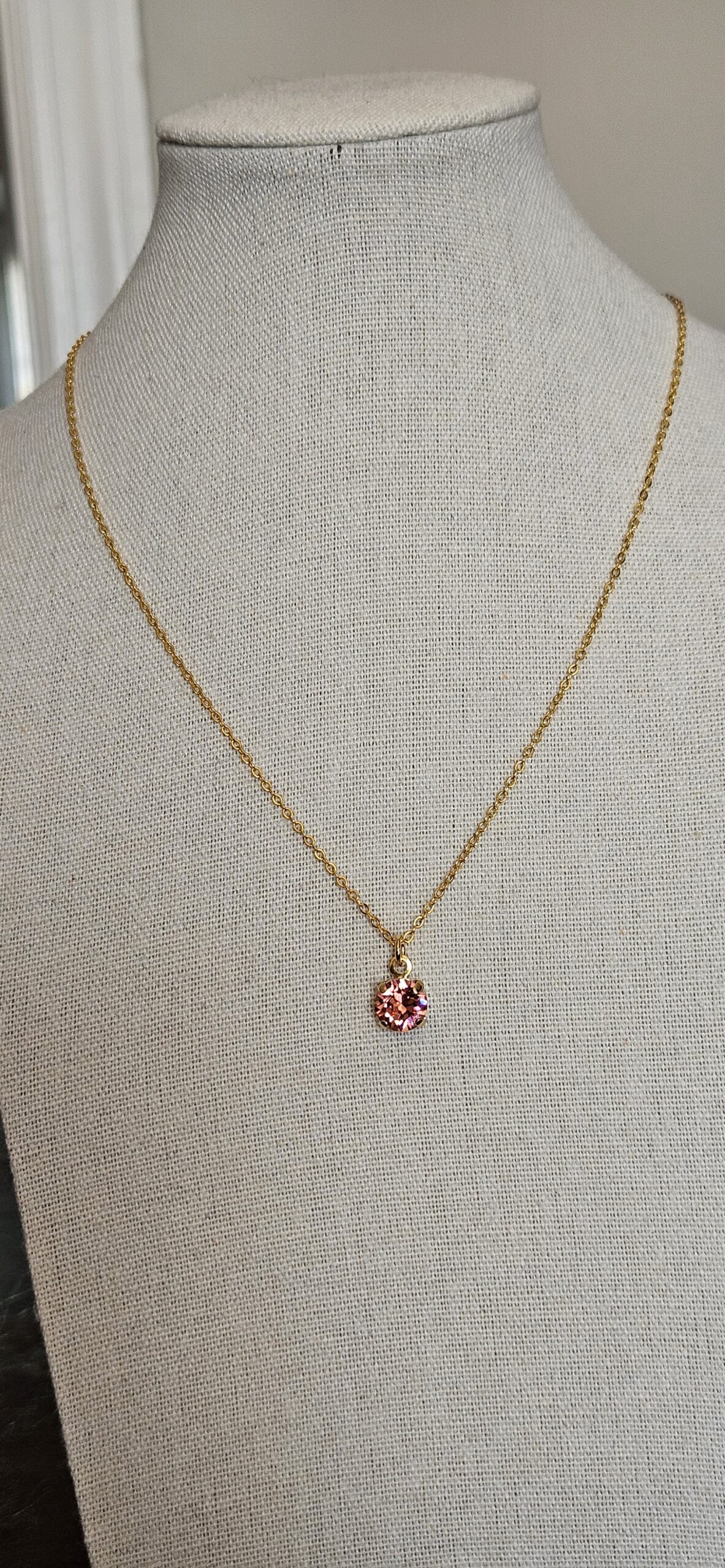 Beautiful shimmery 8mm pink crystal set into a pendant cup and strung along a golden chain. Simple. Elegant. Handmade.