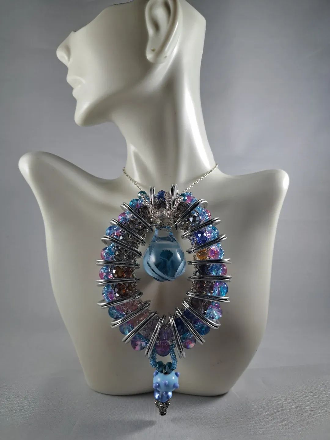 The Aurora Halo Necklace transforms everyday materials into extraordinary art. Crafted with upcycled soda can tabs, radiant glass beads in shimmering blues, purples, and pinks, and a bold teardrop centerpiece, this necklace embodies creativity and sustainable beauty. Its unique halo design blends industrial edge with celestial elegance, making it a true statement piece for those who love jewelry that tells a story of innovation and style.