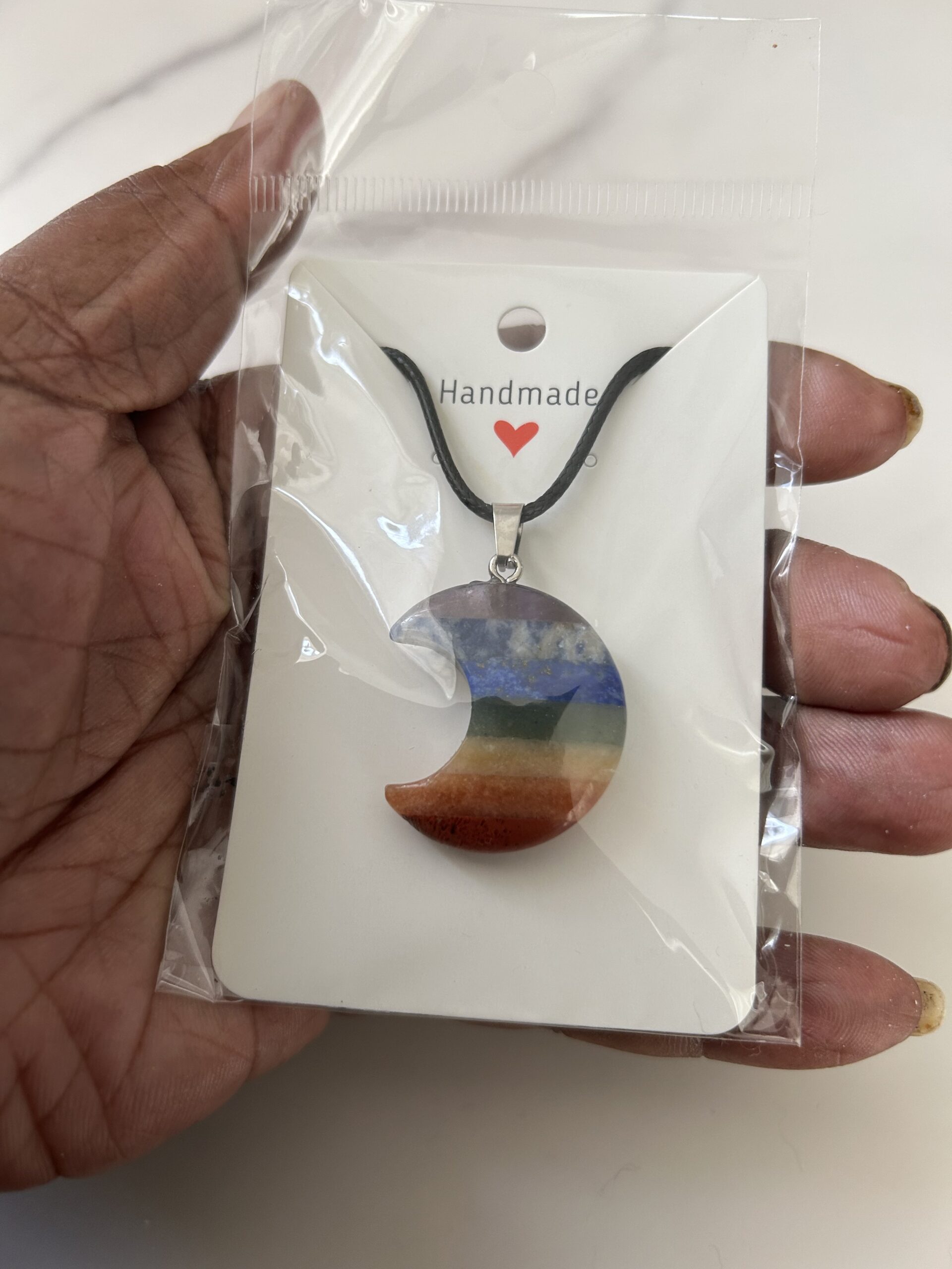 This crescent moon 7 chakra necklace is on a microfiber cord. These crystals address all 7 of our major chakras to keep them in alignment.