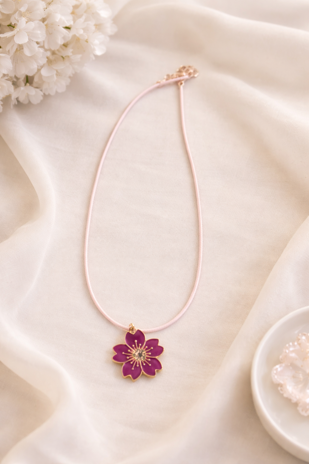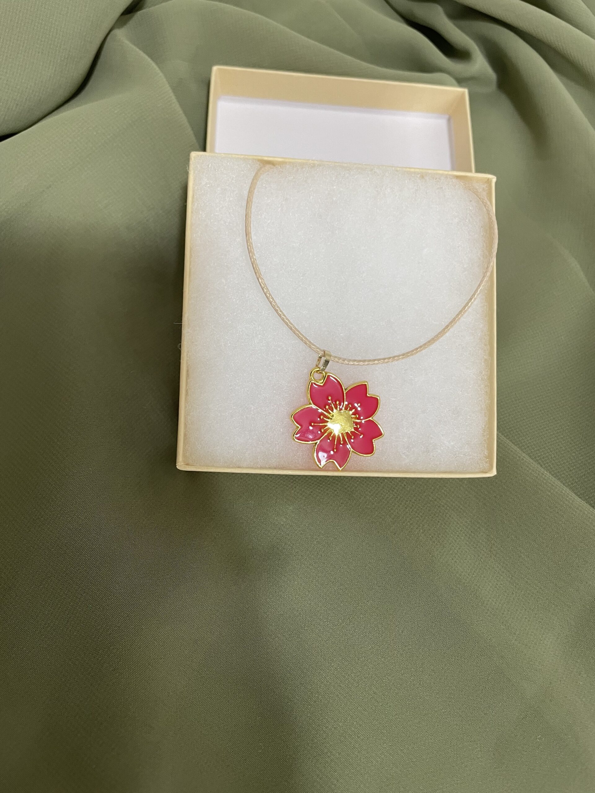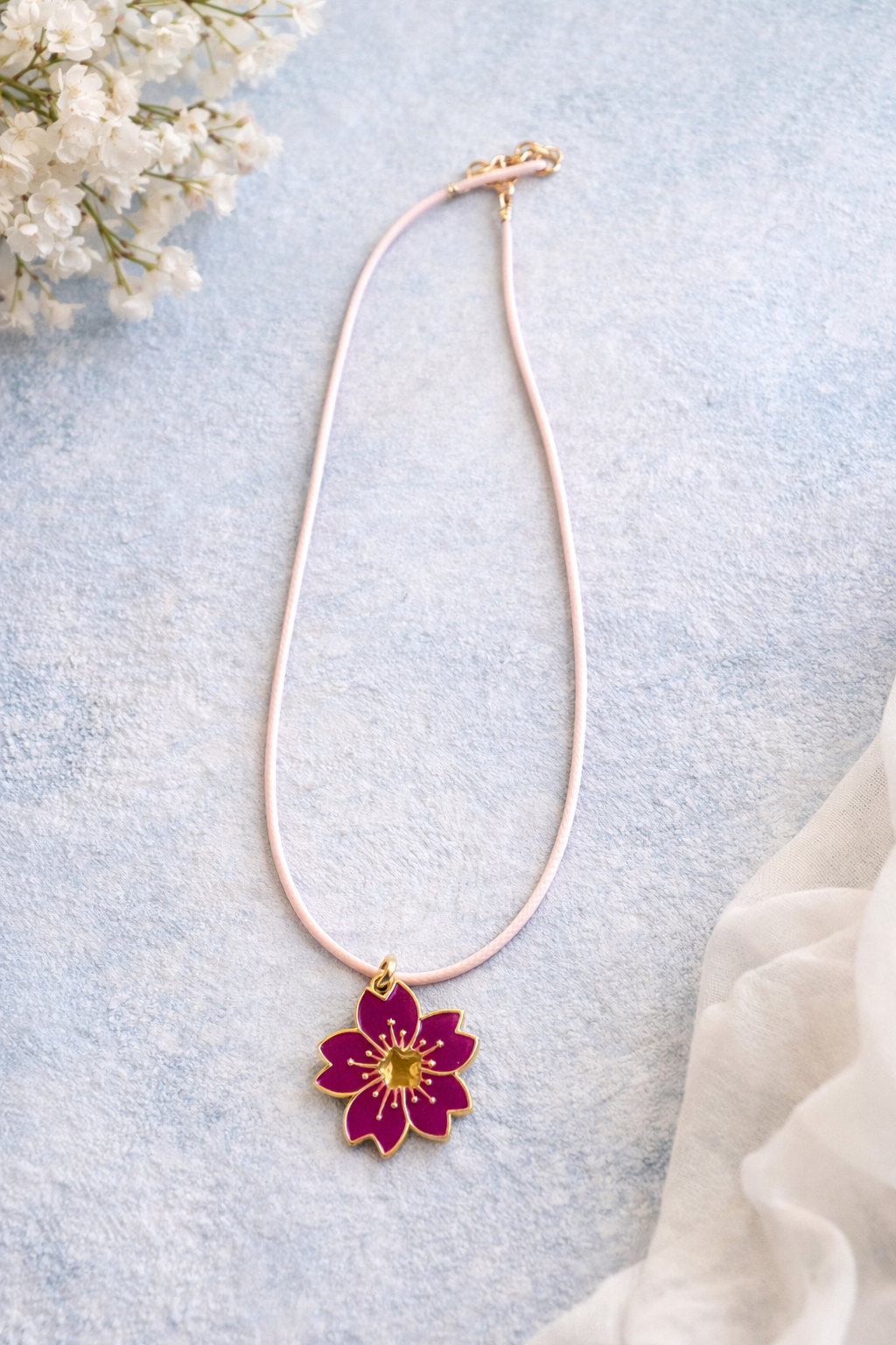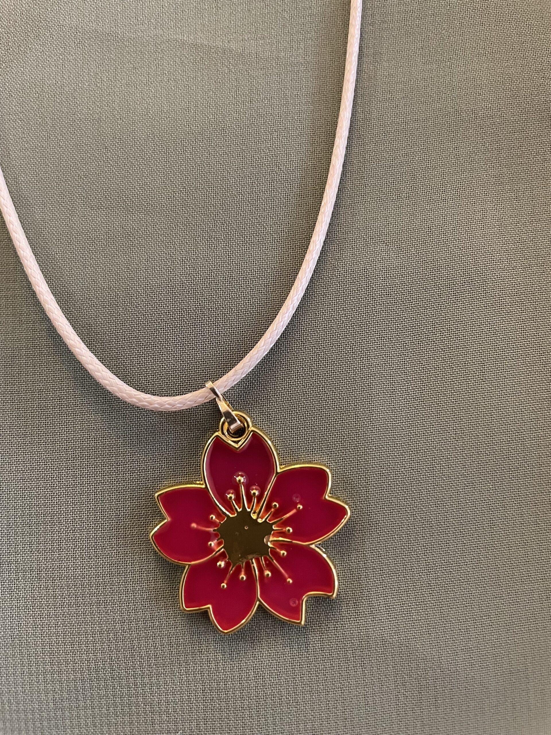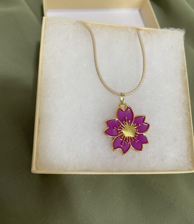 A beautifully detailed blossom pendant outlined in gold, suspended from a soft adjustable cord. Lightweight, feminine, and perfect for everyday wear or gifting.