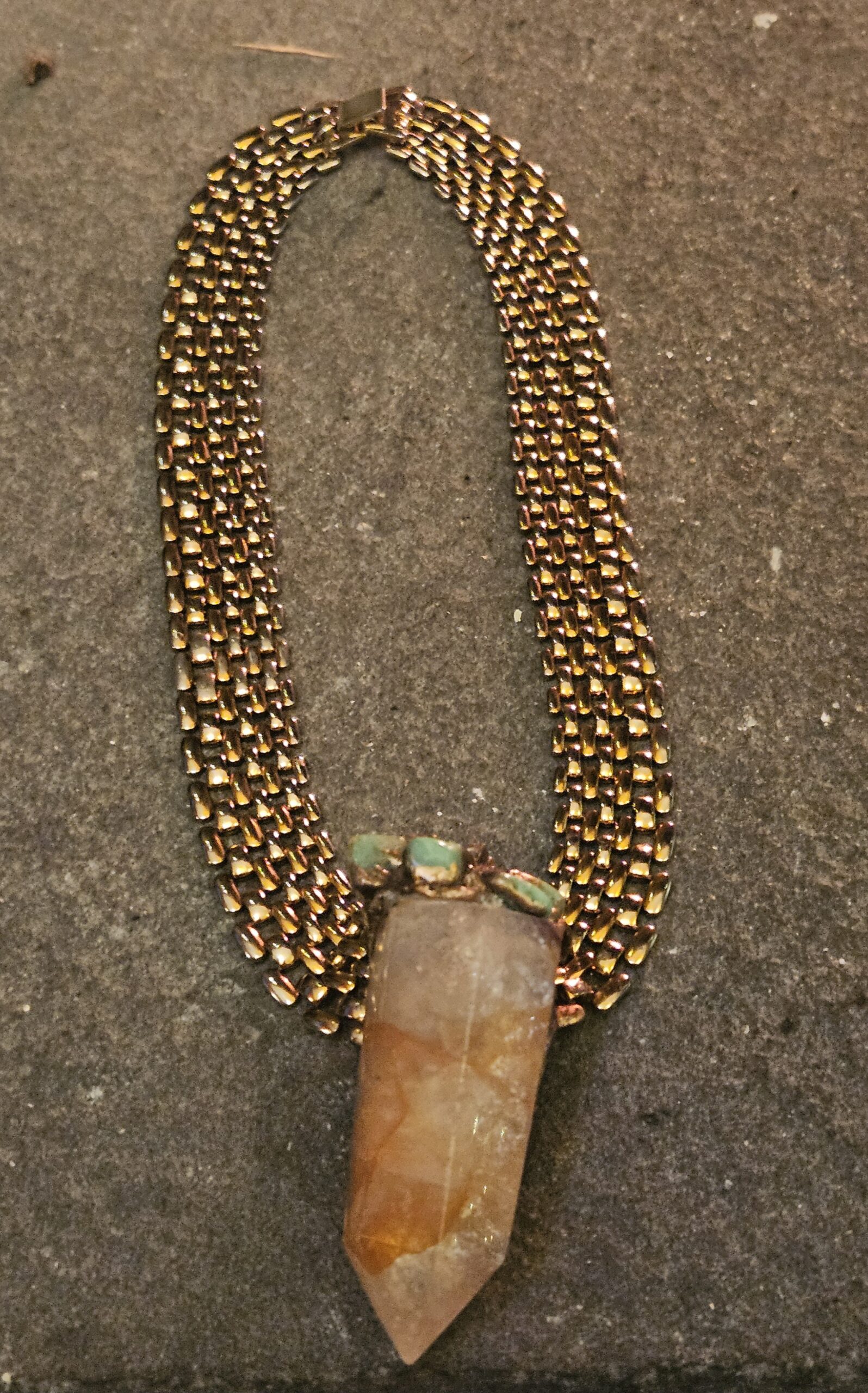 Vintage bib length gold necklace with sculpted citrine orange pointed crystal with chrysocolla