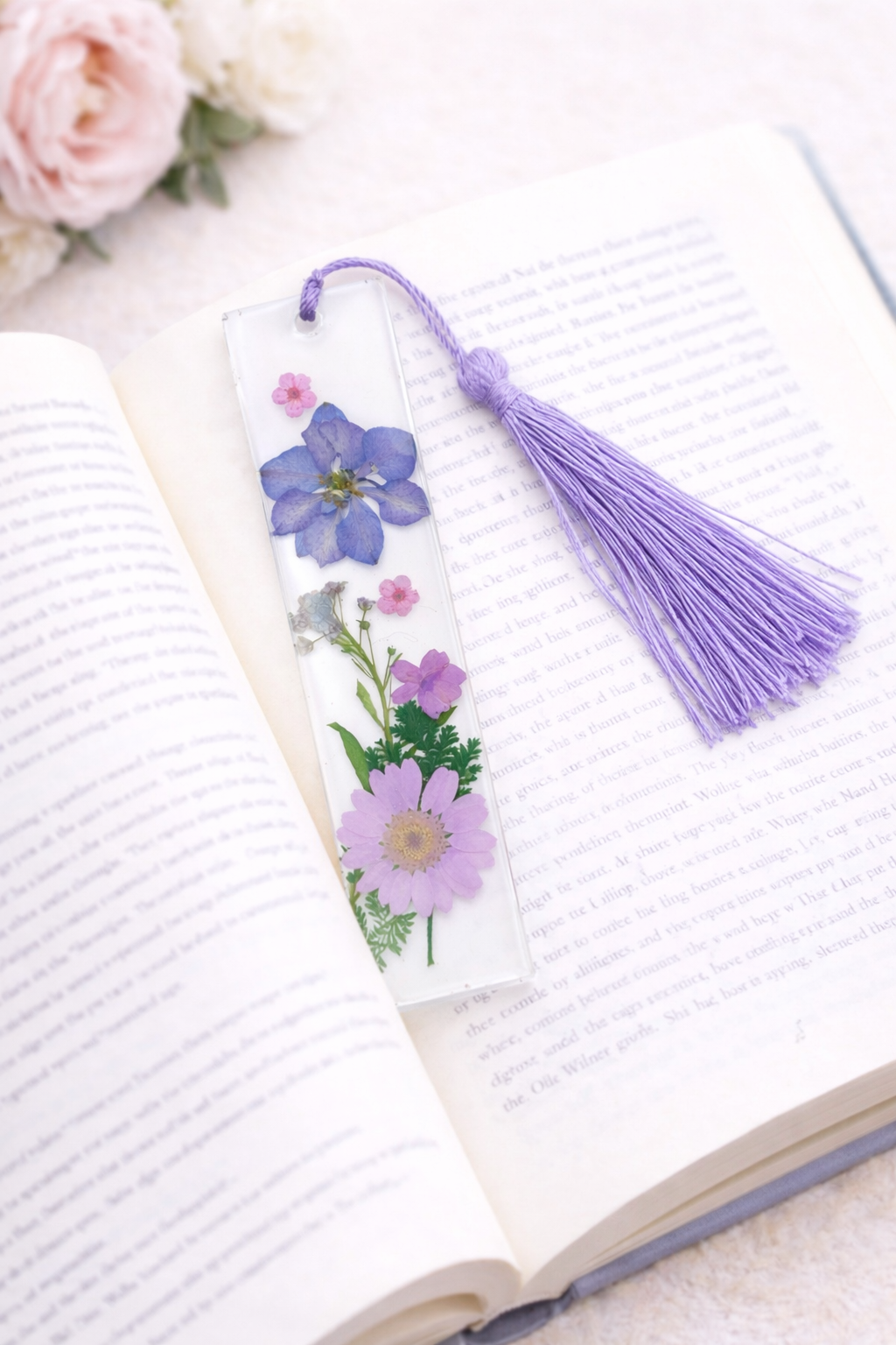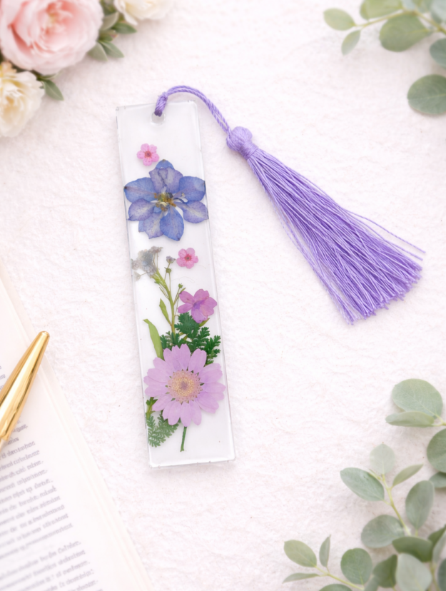 Each bookmark is finished with a matching tassel and carefully assembled to highlight the natural beauty and delicate details of the flowers. No two are exactly alike, making every piece subtly unique.