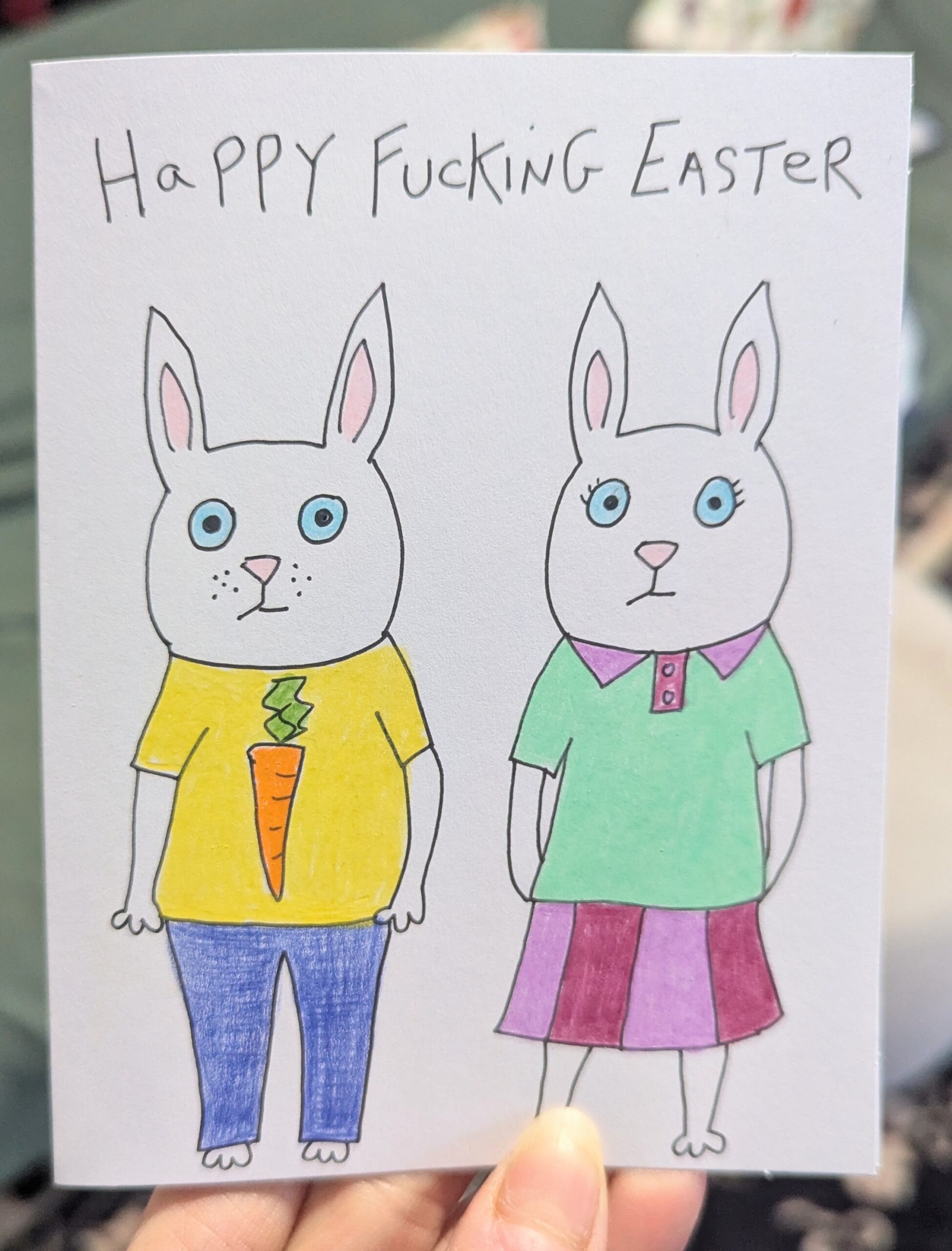 Happy Fucking Easter from a couple of grouchy bunnies in brightly colored clothes.