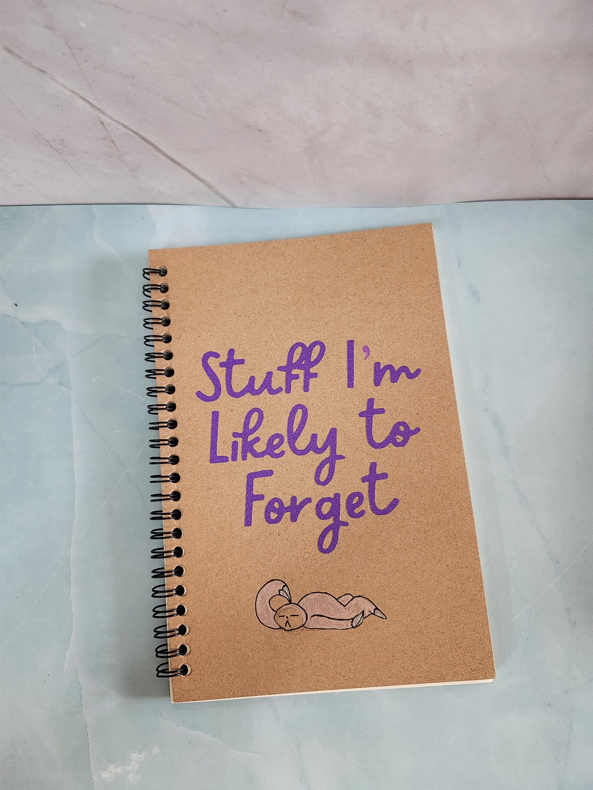 Kraft paper cover notebook embellished with “Stuff I’m Likely To Forget” with a confused sloth. This notebook is the perfect size for travel so you an write down your thoughts on the go.