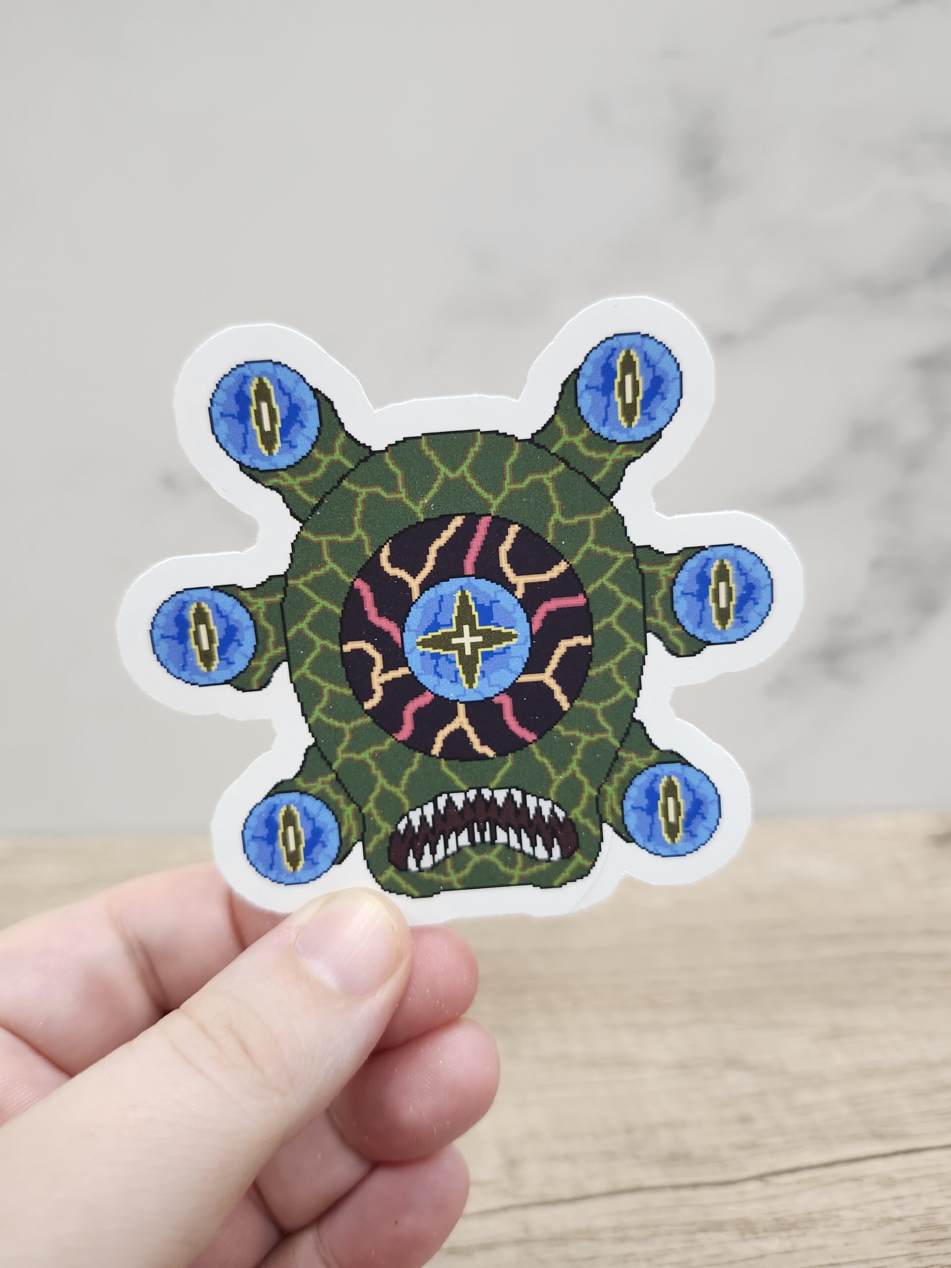 Fun retro pixelated monster based on a certain creature from TTRPG and JRPG games. Apply to your water bottle, laptop, locker, or anyplace you want to customize.