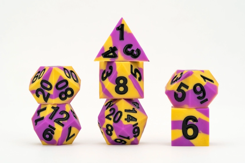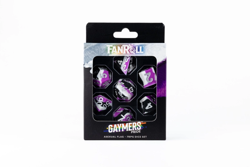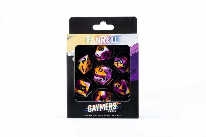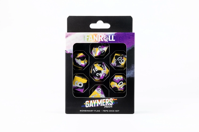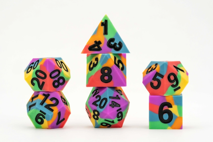FanRoll is working with a new dice material! Sharp Edge Silicone Rubber dice are fun and unique to roll. We created a whole new line of dice to serve the LGBTQIA Community Sharp edges provide a precise roll that is complemented with the slight bounce of silicone. Each full-sized, 16mm set comes with 7 dice (d4, d6, d8, d10, d10% (00-90), d12, and d20).
