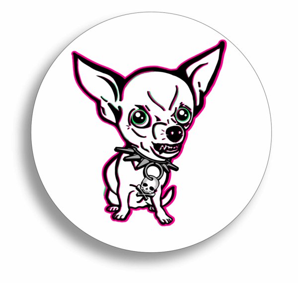 Cute and Angry little Chihuahua button, he comes in coffee mug and a tee. He’s a snarling little punk rocker