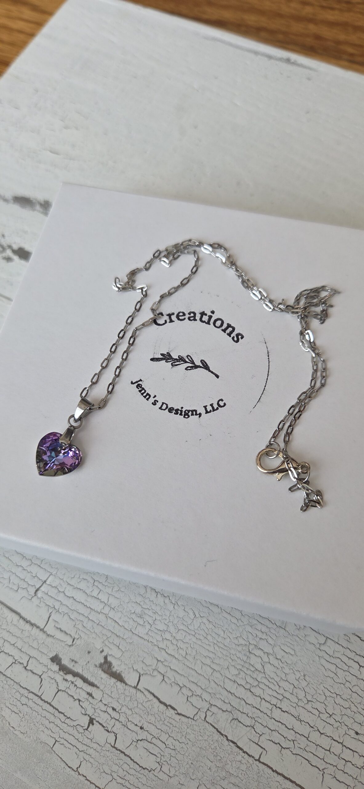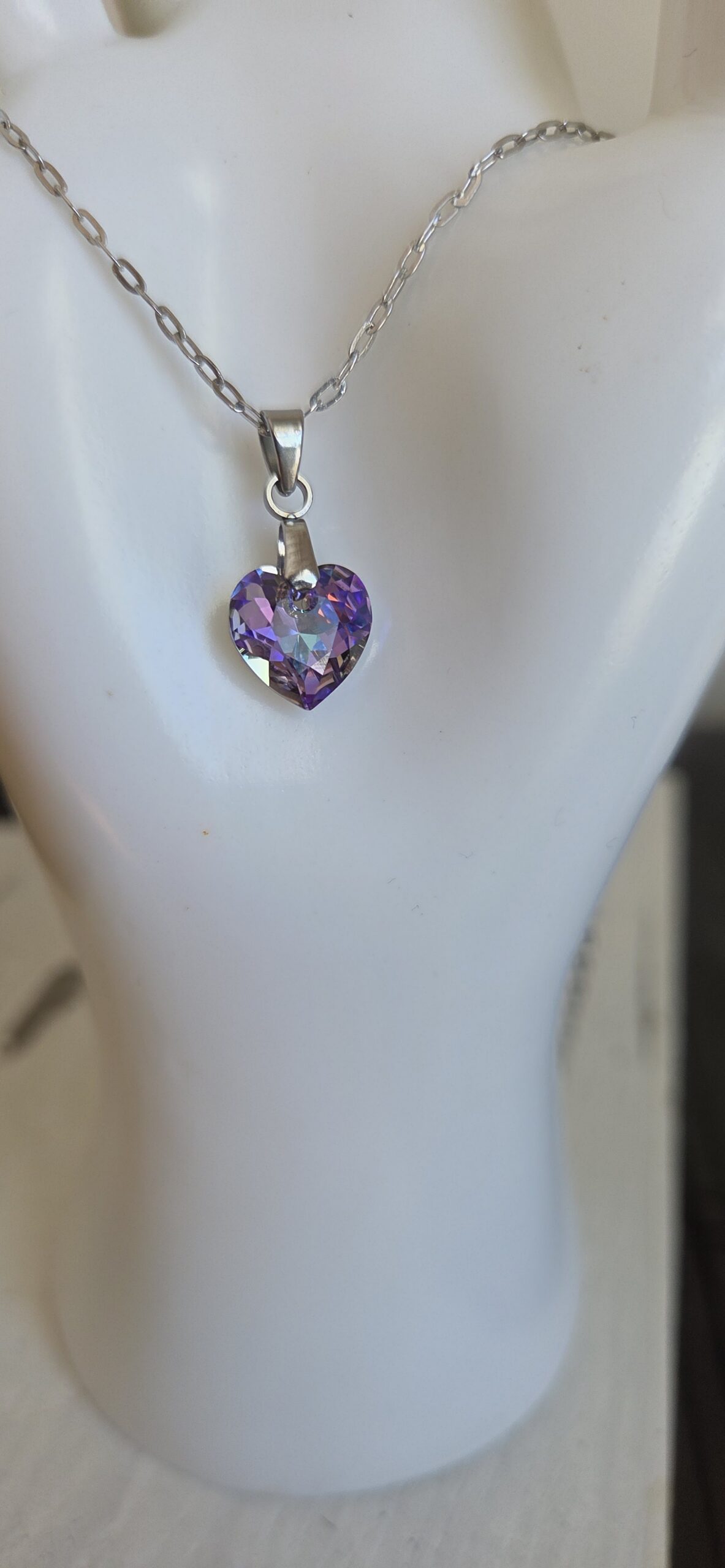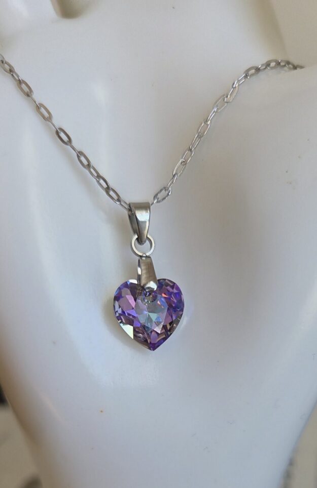 Beautiful little purple heart with a lot of bling! Strung onto a stainless-steel paperclip style chain. Hypoallergenic for sensitive skin. Handmade.